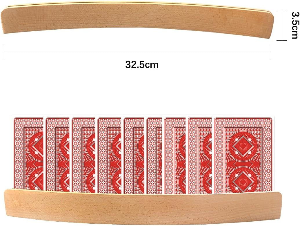 Set 2 suporturi pentru cartile de joc este fabricat din lemn de inalta calitate, dand dovada de o stabilitate de invidiat datorita greutatii sale. Acesta are un finisaj neted si masoara aproximativ 32,5 x 1 x 3,5 cm.