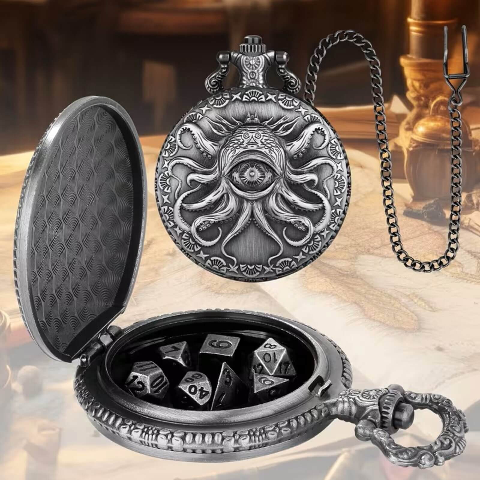 Adauga un strop de magie si stil sesiunilor tale de joc cu Set 7 mini zaruri metalice DND - Cutie cadou, un accesoriu compact dar spectaculos, ascuns intr-o carcasa tip ceas de buzunar cu design octopus. Nu este doar un set de zaruri, ci un mic artefact de colectie care pare desprins dintr-o lume steampunk.