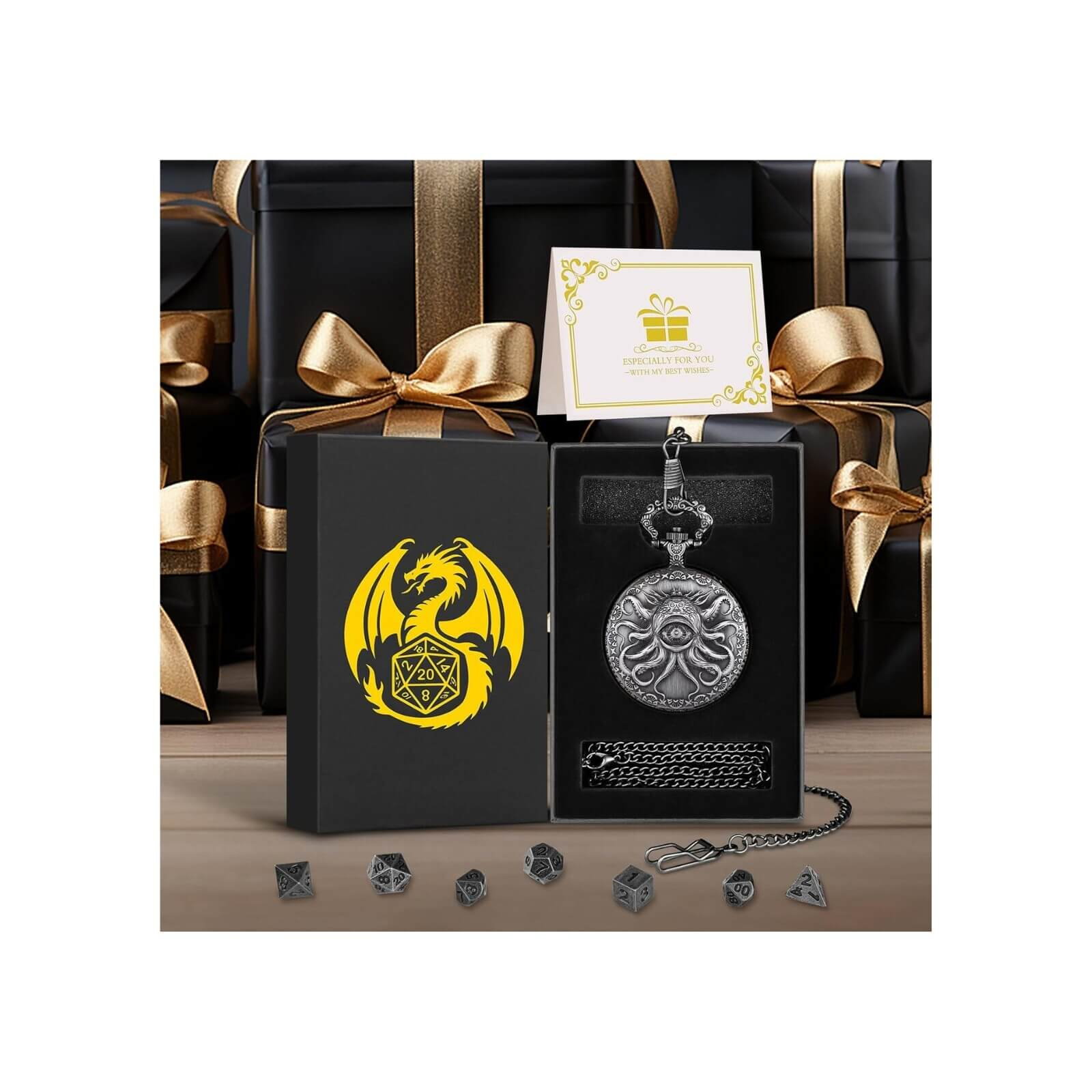 Setul include 7 zaruri miniaturale poliedrice din metal, o carcasa tip ceas de buzunar cu design octopus pentru depozitare, doua lanturi (80 cm si 37 cm), burete interior pentru protectie, cutie cadou eleganta si felicitare.