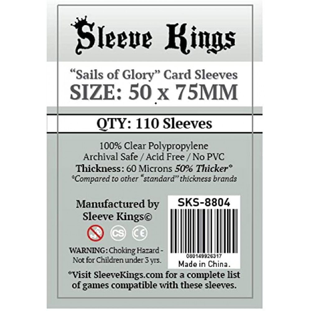 Sleeve Kings Sails of Glory Card Sleeves - 50x75mm sunt sleeve-uri standard concepute pentru carti de dimensiuni mici, oferind protectie eficienta si durabila pentru jocuri care folosesc acest format. Cu o grosime reala de 60 microni, aceste sleeve-uri sunt considerabil mai rezistente decat sleeve-urile standard obisnuite, protejand cartile impotriva uzurii, zgarieturilor si indoiturilor.
