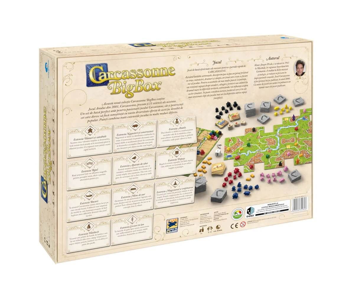 Vestitul joc de strategie a cucerit o multime de impatimiti ai jocurilor de societate, iar acum vine intr-o super varianta! Carcassonne - Big Box (RO) contine jocul de baza, premiat in anul 2001, si 11 extensii ale acestuia.