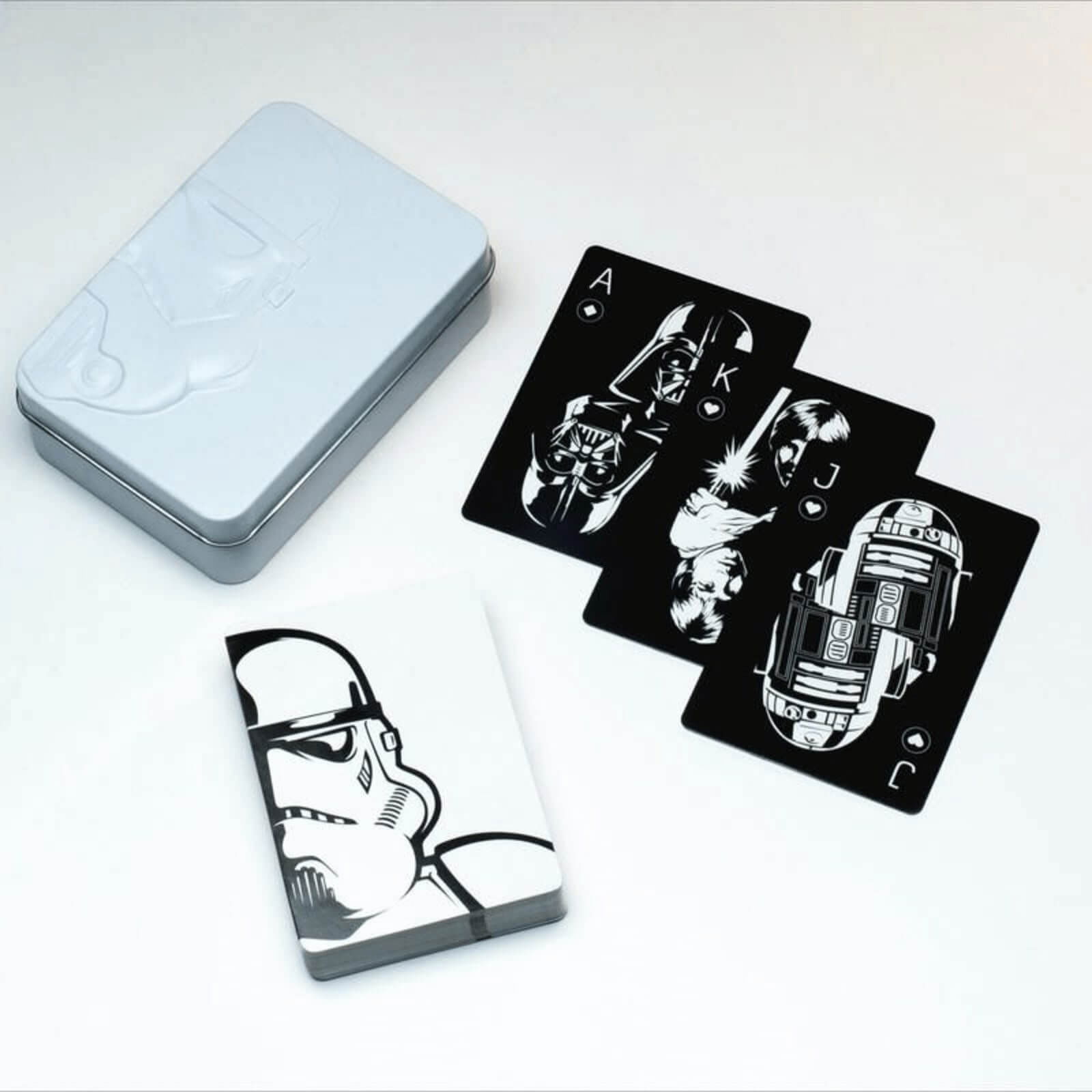 Aceste Carti de joc Star Wars (cutie metal) sunt depozitate intr-o cutie metalica si au o marime standard, iar fata acesteia este gravata cu chipul unuia dintre personaje si anume Stormtrooper. Asa ca nu mai pierde timpul si pune mana pe pachet, alegand la intamplare o carte si descopera care dintre personajele seriei iti va pica de fiecare data.