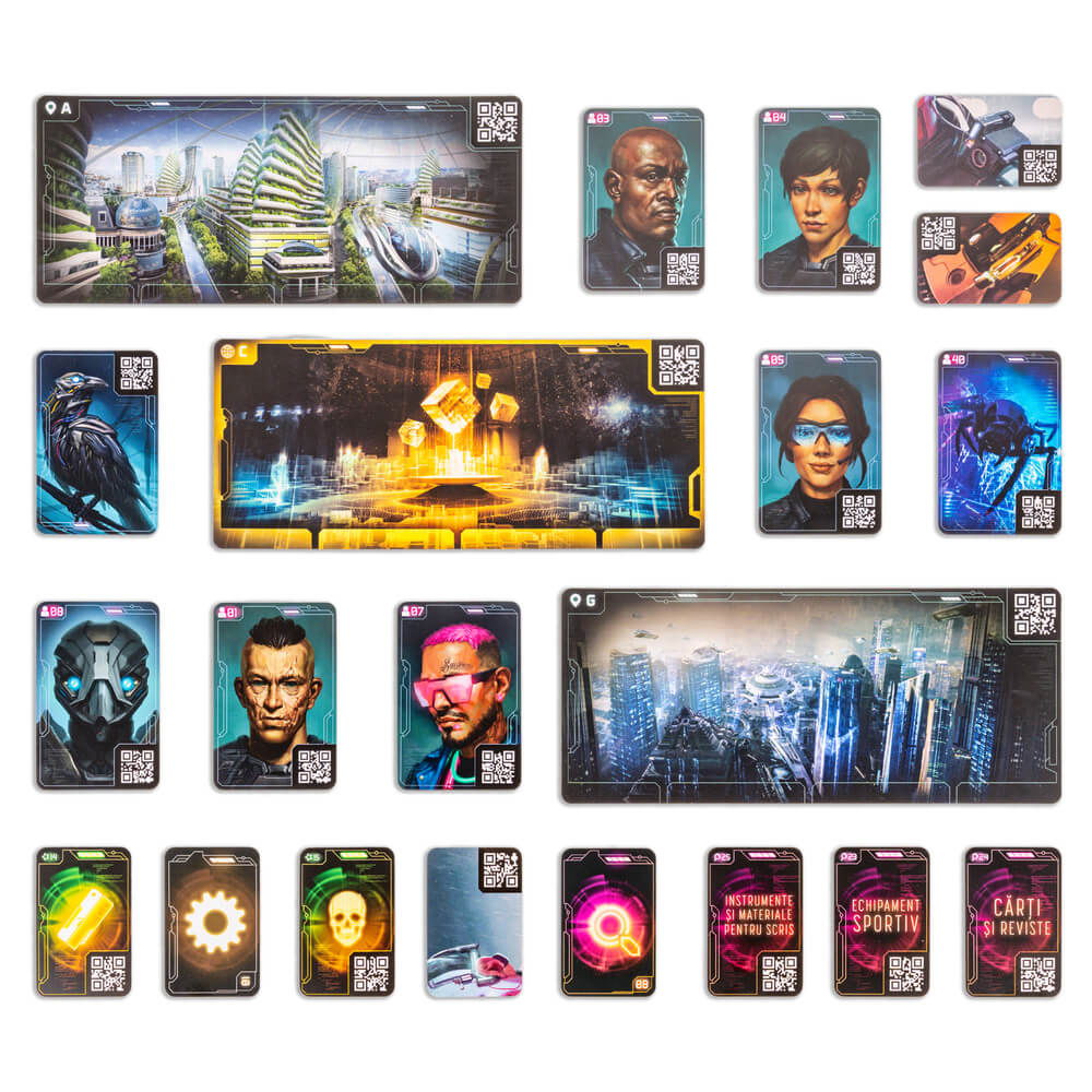 40 de cartonase cu Personaje, 38 de Cartonase cu Dovezi, 15 Cartonase Obiecte Speciale, 7 locatii cu 2 fete, 1 locatie Acasa, 4 Cartonase cu Implanturi, 1 Tabla pentru implanturi, 1 Cartonas Corb, 1 Tabla pentru Implanturi si Instructiuni de joc.