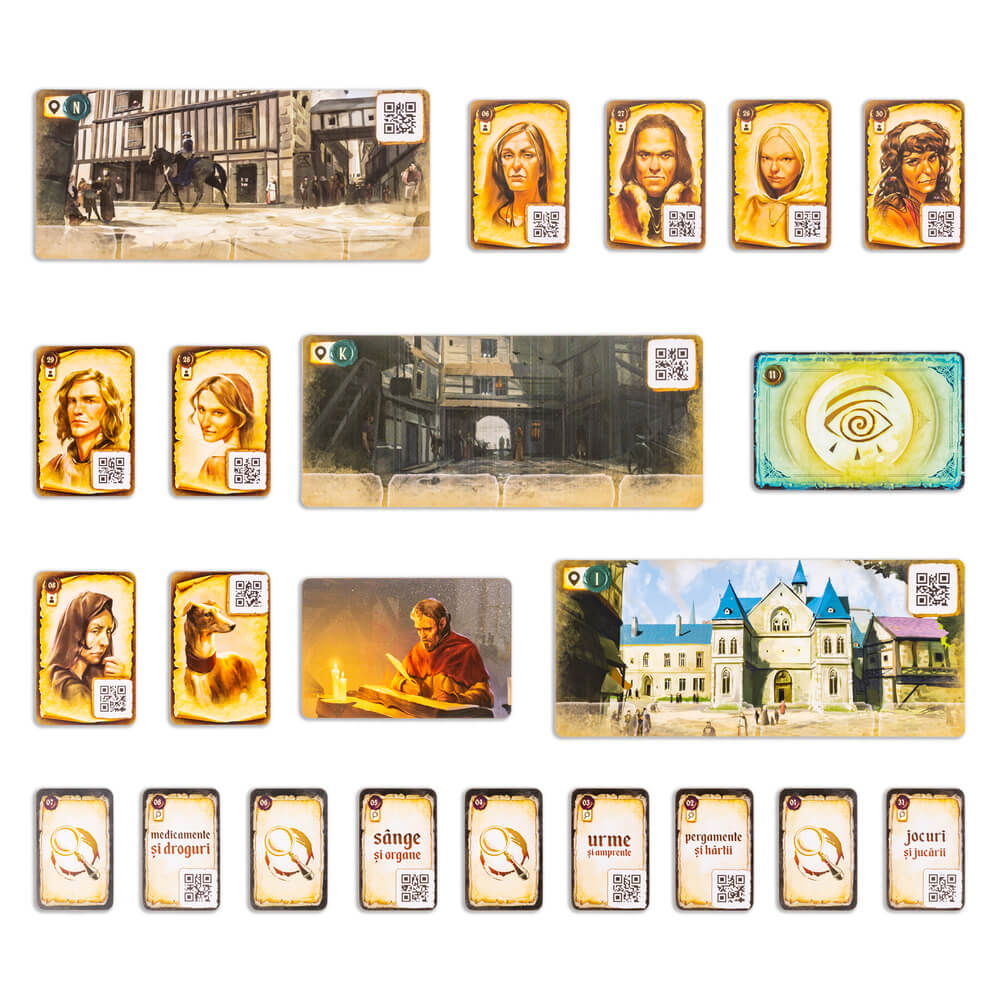 30 de cartonase cu personaje, 38 de cartonase cu dovezi, 15 cartonase cu obiecte speciale, 7 locatii cu 2 fete, 1 locatie acasa, 20 de cartonase cu viziuni, 1 cartonas caine, 1 tabla pentru dovezi si instructiuni de joc.