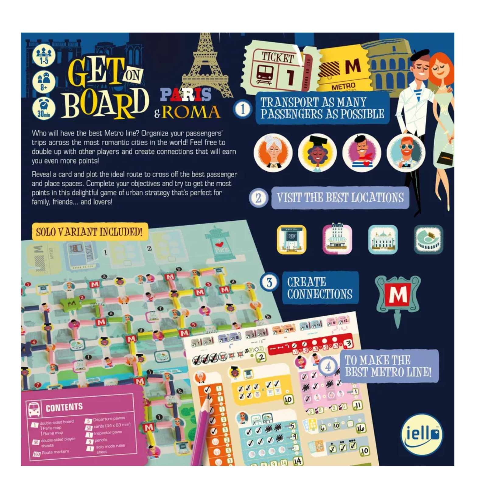 Get on board: Paris and Rome (EN). Pornind de la farmecul inegalabil al Parisului si Romei, Get On Board: Paris and Rome este un joc flip-and-write captivant, ideal pentru 1 pana la 5 jucatori. Vei trasa rute pe harta orasului ales, incercand sa obtii puncte prin realizarea de conexiuni strategice si transportarea pasagerilor. Cu reguli intuitive si o tema urbana plina de viata, jocul este accesibil atat pentru familii, cat si pentru pasionatii de strategie.