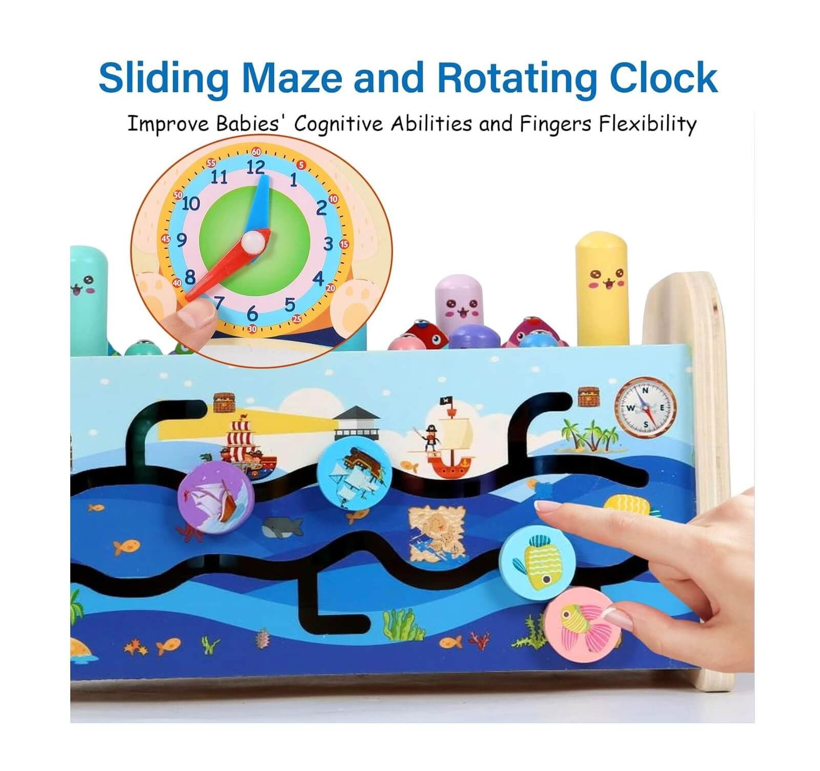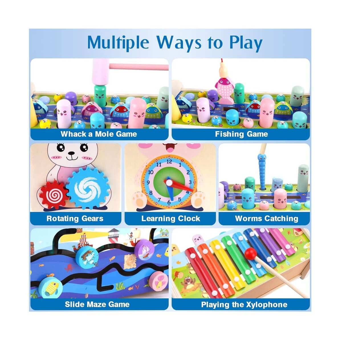 Activitatile pe care micutii le pot intreprinde prin intermediul acestui Joc interactiv pentru copii 7 in 1 sunt: lovirea cartitei, pescuitul, prinderea gandacului, jocul labirintului, invartirea rotitelor, invatarea ceasului si cantatul la xilofon.