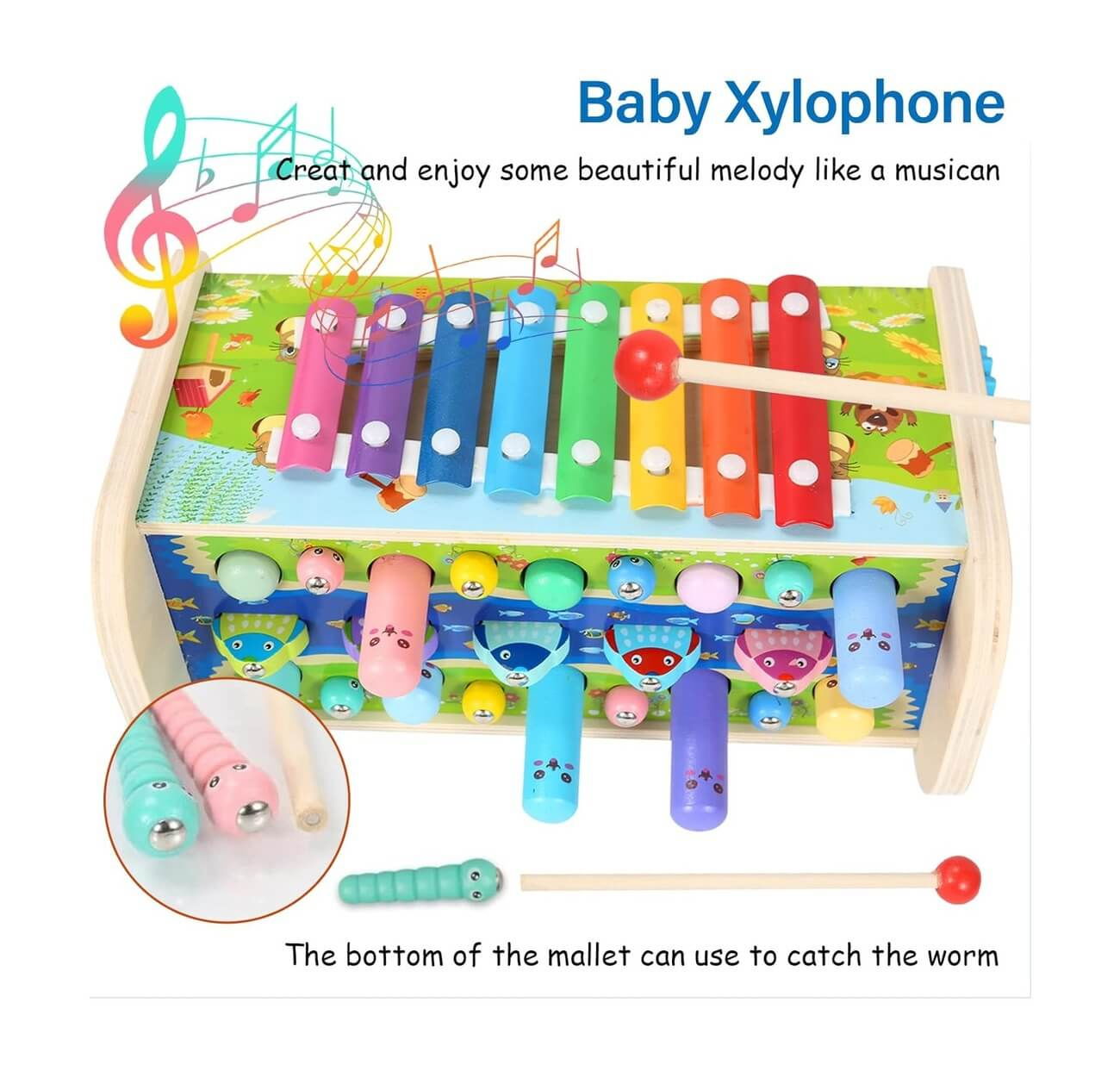 1 banca clasica de lemn, 2 undite, 3 ciocane (1 pentru xilofon si 2 pentru jocul gopher), 13 piese din lemn.