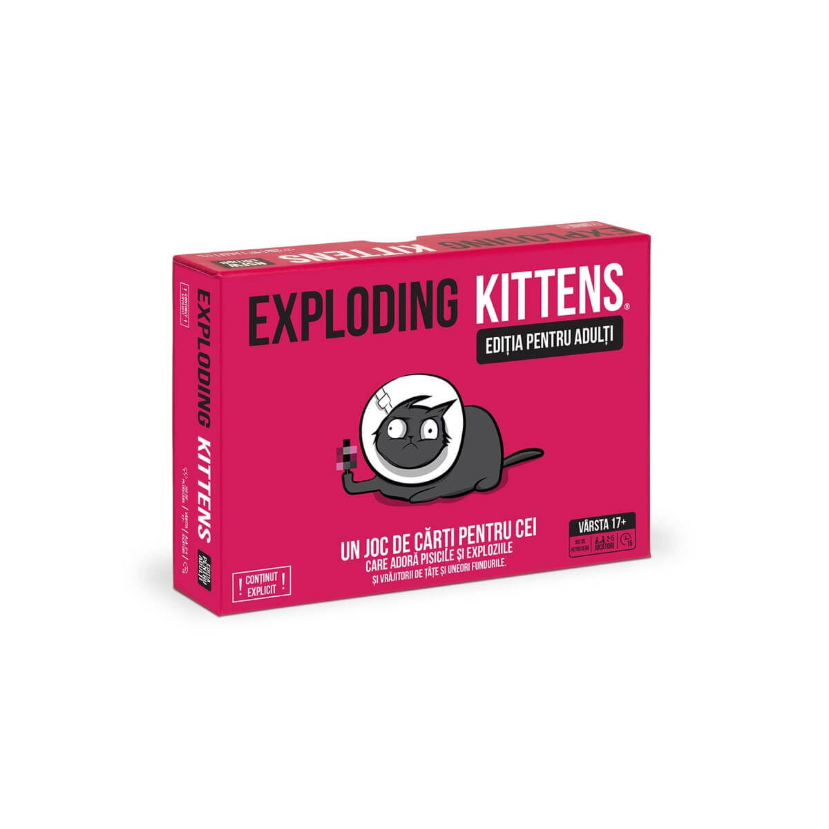 Cutia Exploding Kittens pentru Adulti (RO) include 56 de carti ilustrate in stil NSFW, cu Exploding Kittens, Dezamorsare, Skip, Atac, Vezi in Viitor, Amesteca, Favor, precum si cele speciale de tip Carti Pisica si combinatii. Contine tot ce este necesar pentru a juca pana la 5 jucatori, dar poate fi combinat cu un alt pachet pentru a gazdui pana la 9 jucatori.