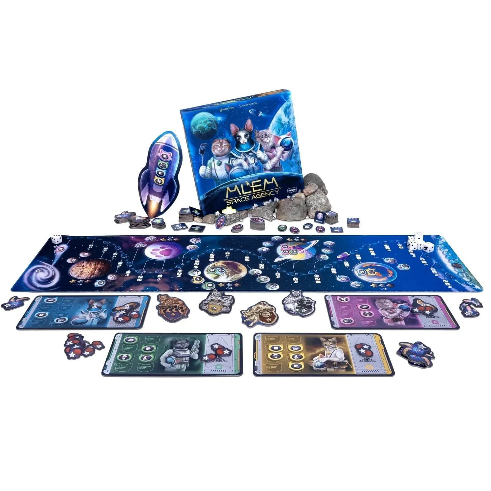 MLEM - Astromiauti (RO-UKR) este un joc de societate plin de umor si suspans in care pisicile au cucerit spatiul si pornesc in expeditii galactice riscante. Jucatorii conduc centre de explorare felina si trimit astronauti-pisici in misiuni cosmice pentru a descoperi planete, luni si zone indepartate ale galaxiei.