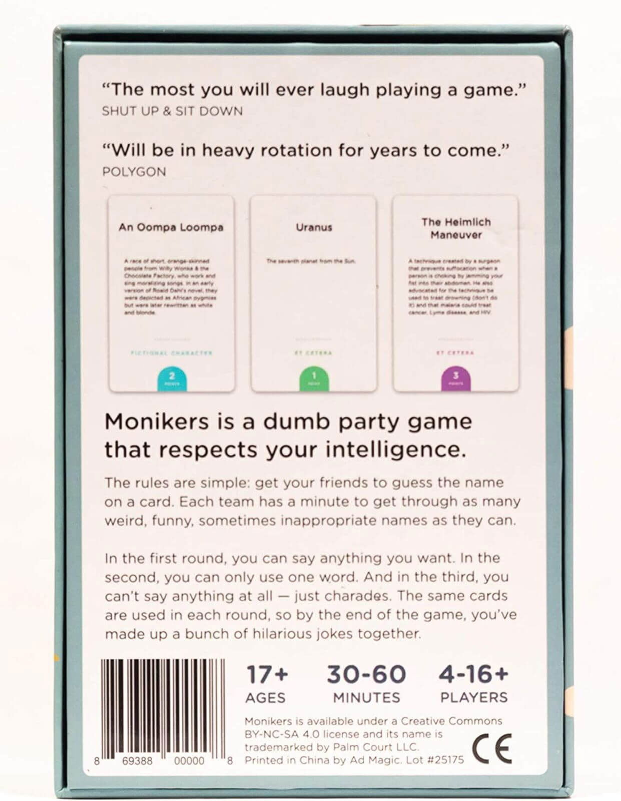 Monikers (EN) se joaca in echipe si este structurat in 3 runde consecutive, folosind exact aceleasi carti in fiecare runda.