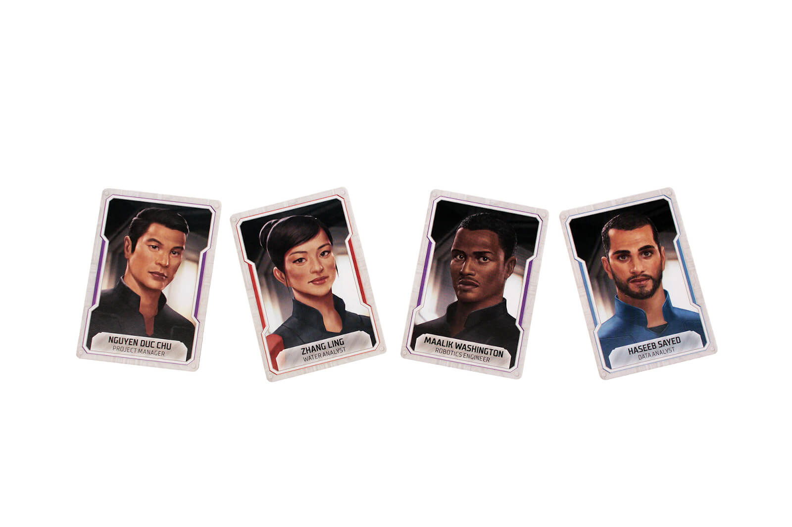 Zaruri Echipaj in 4 culori diferite (Robot, Ofiter, Colonist, Jetoane Resursa), Ecusoane Sef de Operatiuni, Indicatoare Puncte de Merit, Echipaj in hibernare, Succes, Esec, Inactiv, Runda, Desfasurare actiune, Cartonase de joc (Misiuni critice, Misiuni Operationale, Dosare, Plan, Probleme, Obiective episod, Obiective personale, Echipaj, Reguli, Locatii nava), Tabel de scor, Tabla nava, Placuta cazarma, Avantaje Ofiter, brosura Poveste si instructiuni de joc in limba engleza.