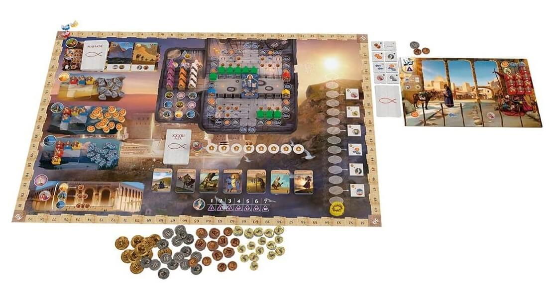 1 tabla de joc principala, 4 table individuale pentru jucatori, 4 piese Iluminare, 4 piese Depozit blocat, 3 piese Locatie blocata, 32 marcatoare Favor, 28 piese Pilda, 50 piese Ofranda, 15 piese Locatie, 60 Monede, 7 piese Judecata Sinedriilor, plus alte 8 aditionale pentru modul solo, 10 cartonase de Start pentru fiecare jucator, plus alte 20 pentru jocul in doi sau pentru cel solitar, 23 cartonase Mehane, 10 cartonase d. Hr., 4 cartonase Ajutor pentru 3-4 jucatori, 2 cartonase Ajutor pentru 1-2 jucatori, 25 cartonase Barabas pentru 1 jucator, 1 cartonas Iisus, 12 marcatoare Apostol, 60 Adepti, 30 jetoane Piatra, 30 jetoane Paine, 30 jetoane Peste, 4 marcatoare de scor Porumbel, 1 marcator Sanhedrin, 4 marcatoare Favoruri indeplinite, regulament,
