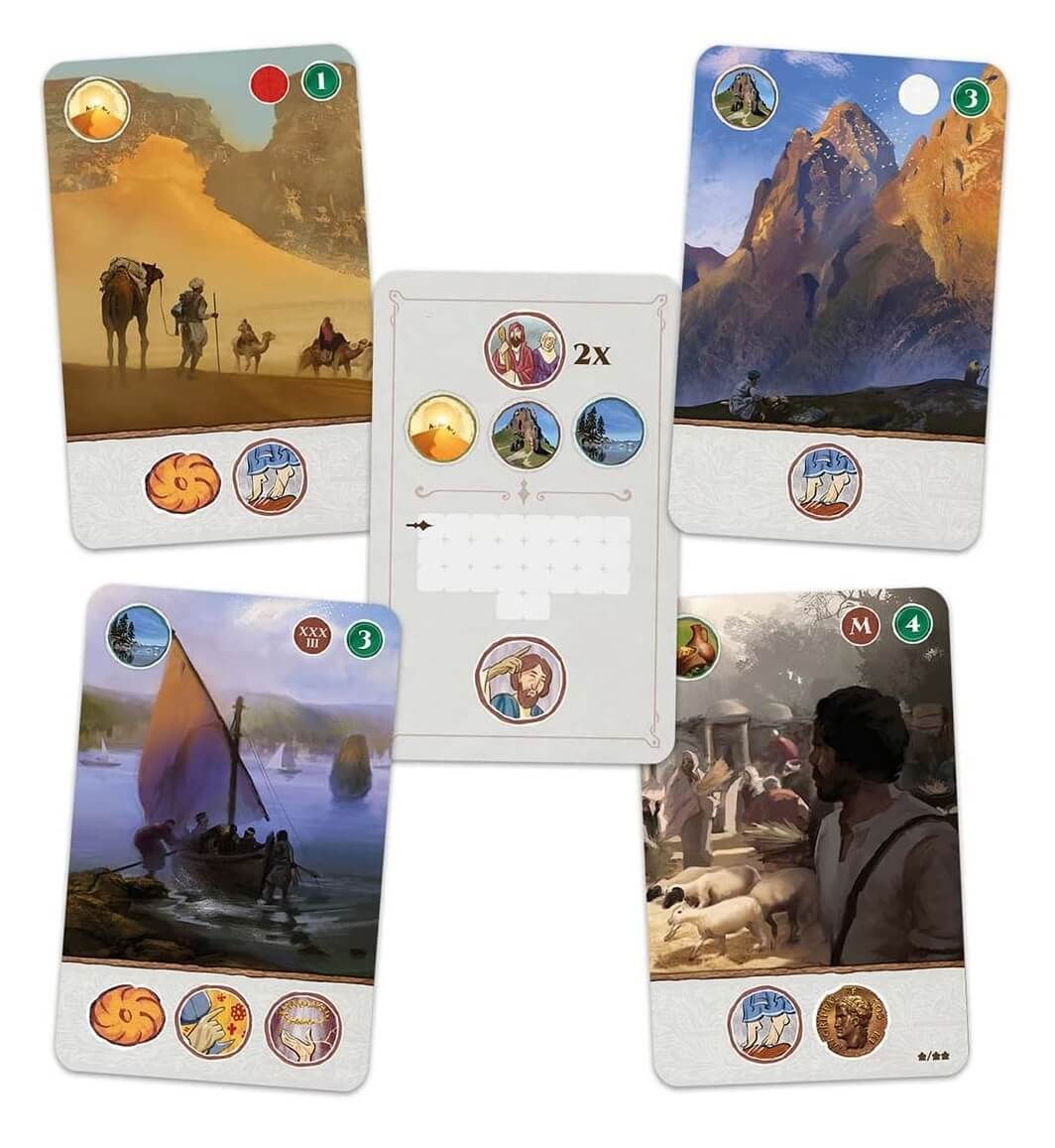 Cartonasele sunt elementul principal al jocului. Acestea au un simbol care corespunde uneia dintre cele cinci locatii din joc, iar combinatiile formate ii vor aduce la masa pe apostoli. Asezarea optima a adeptilor se va face si prin gestionarea scrisorilor, precum si a diverselor resurse puse la dispozitie.