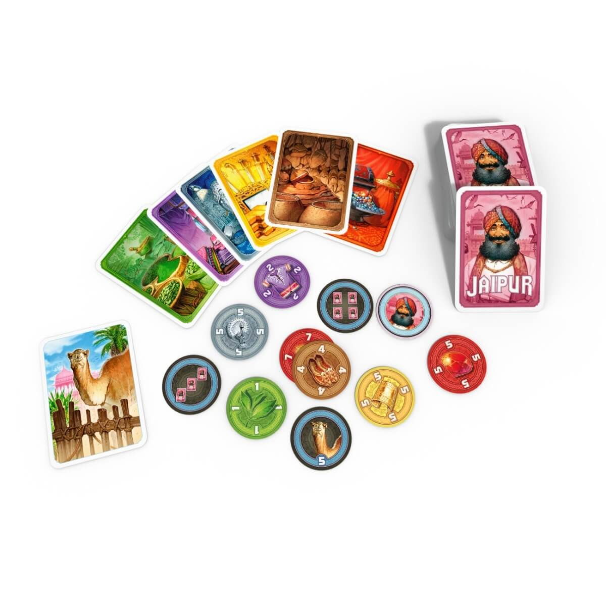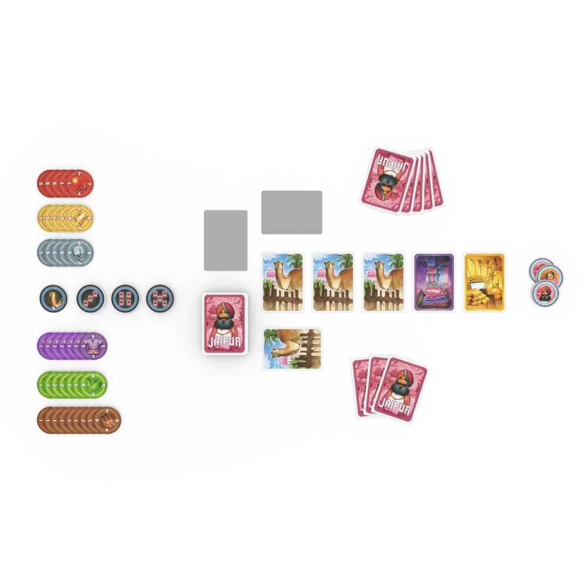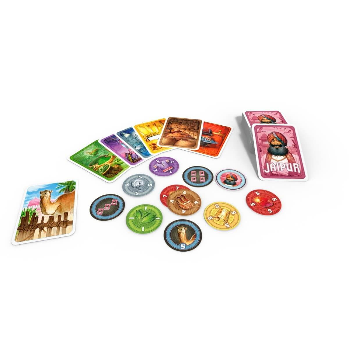 Cutia Jaipur (RO) include 55 carti de marfuri cu diamante, aur, argint, mirodenii, piele, textile si camile, 38 jetoane de marfuri, 18 jetoane bonus, 1 jeton de camila, 3 Sigilii de Excelenta si, desigur, regulamentul de joc.