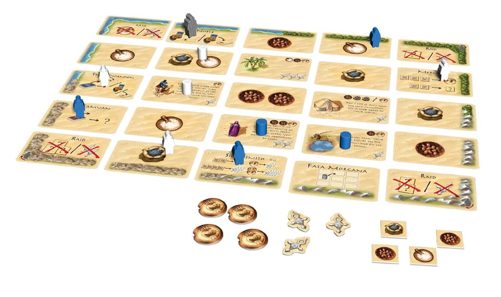 Actiunile disponibile includ colectarea de resurse (curmale, sare, piper), castigarea de aur, achizitionarea de carti trib sau folosirea unor efecte speciale precum Silversmith sau Fata Morgana. Cartile trib aduc puncte de victorie si avantaje permanente, fiind asezate intr-o grila de 3x4 care recompenseaza combinatiile tematice – patru carti de acelasi simbol ofera 4 puncte bonus, iar patru simboluri diferite aduc 2 puncte suplimentare la finalul jocului.