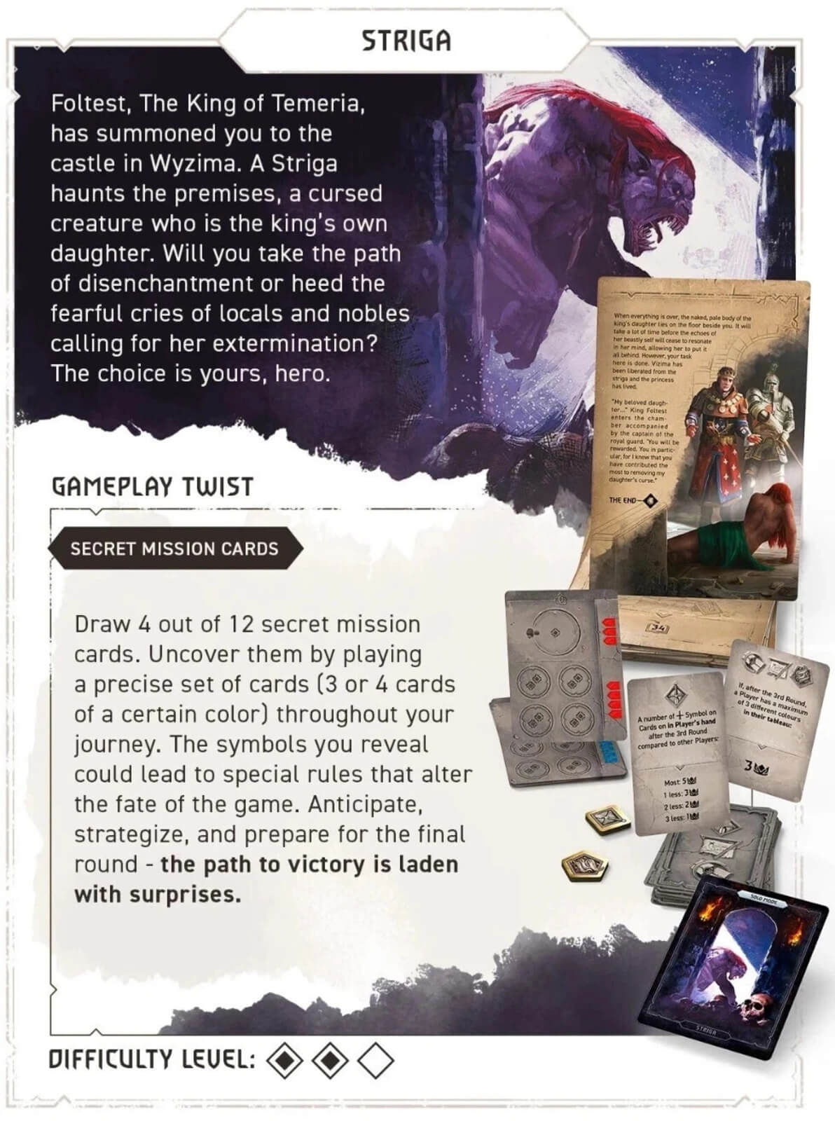 Jocul include, de asemenea, 23 Tale cards pentru fiecare poveste, 32 Alliance cards, 12 Secret Objective cards, 12 Extra Effort cards, Requirement cards, tokenuri speciale si un set complet dedicat modului Solo, cu 5 Automa boards si carti specifice.