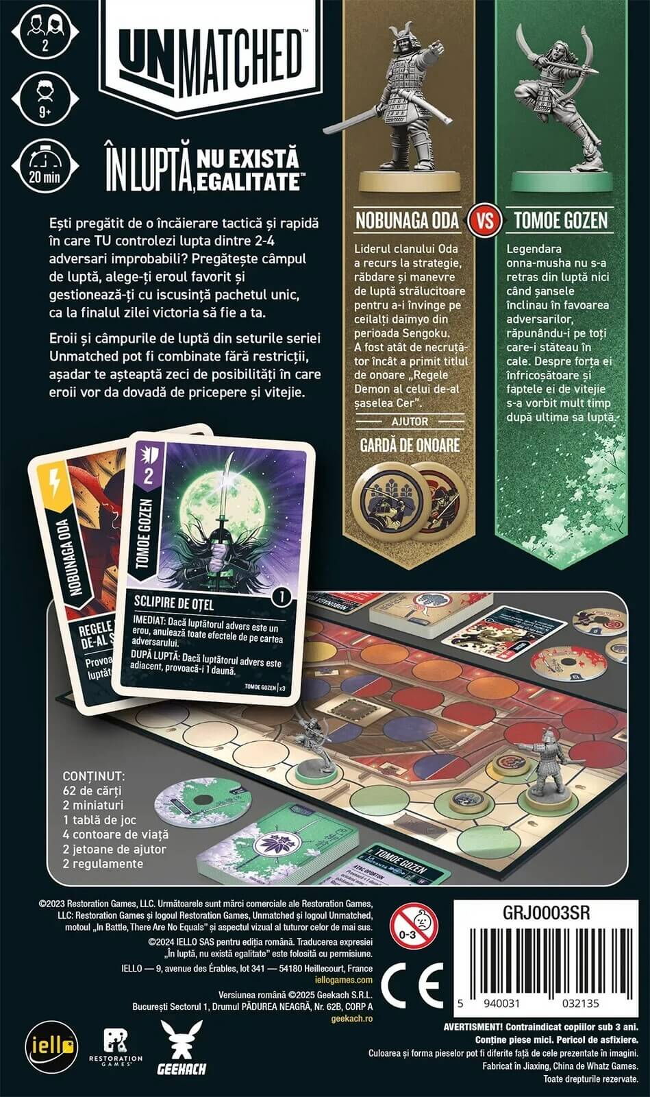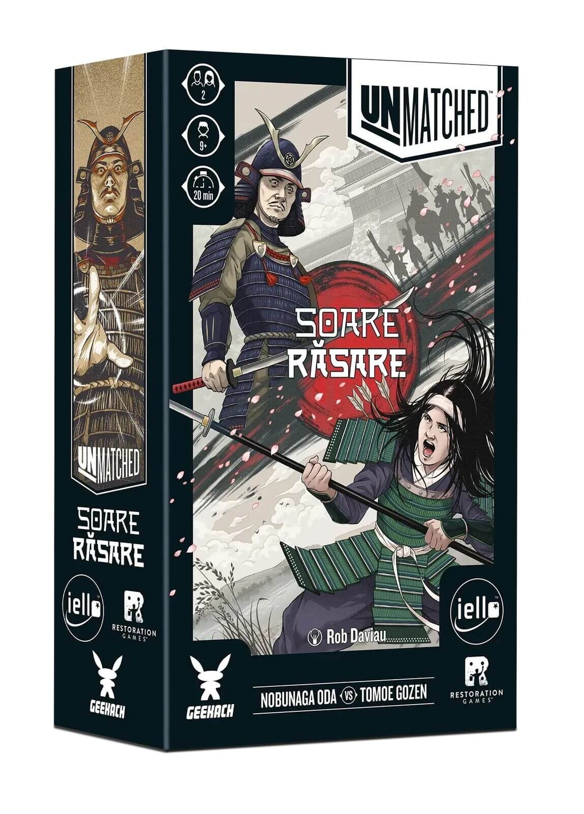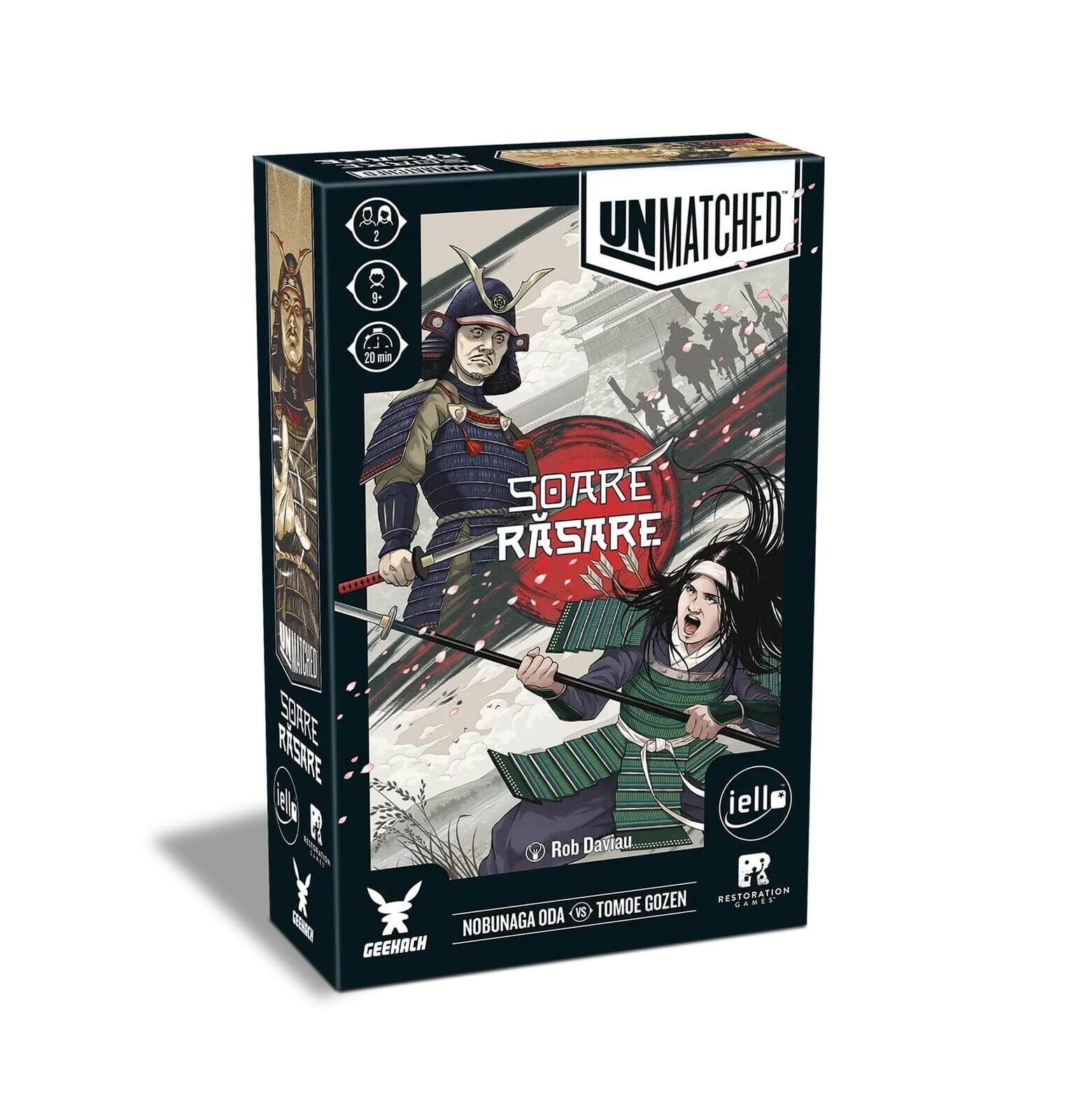 Unmatched - Soare Rasare (RO) este un joc de societate tactic de duel in care doi eroi legendari ai Japoniei feudale se infrunta intr-o batalie strategica plina de manevre si decizii rapide. Nobunaga Oda, celebrul daimyo care a incercat sa unifice Japonia, si Tomoe Gozen, legendara razboinica onna-musha, se intalnesc intr-o confruntare memorabila unde fiecare miscare poate decide rezultatul luptei.