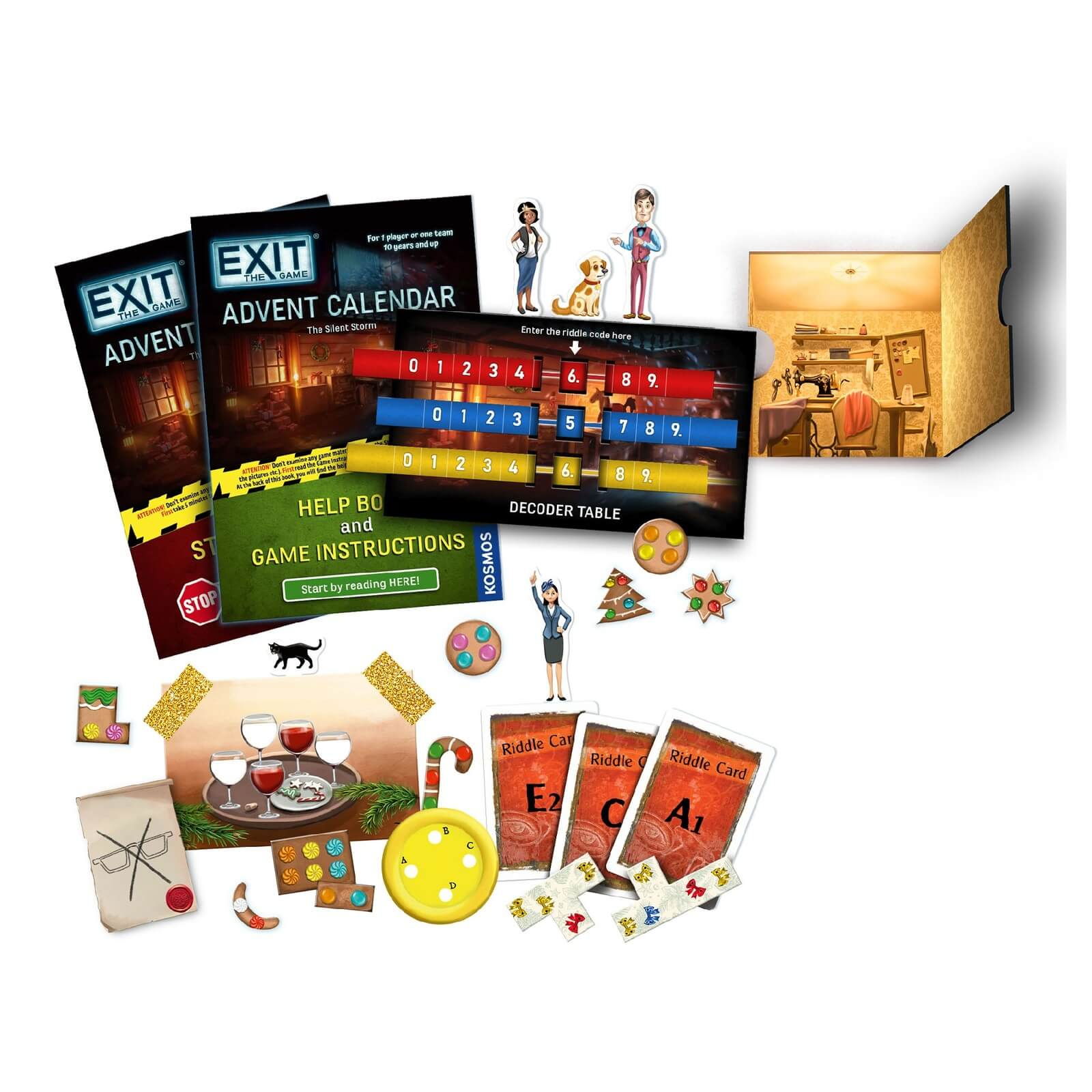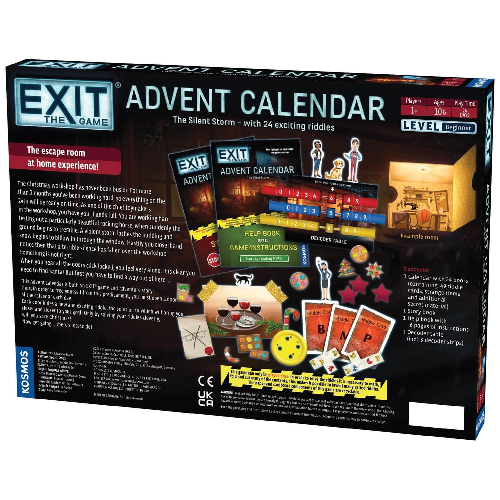 In Exit Advent Calendar: The Silent Storm (EN), jucatorii deschid cate o usa a calendarului in fiecare zi din decembrie, descoperind zilnic o noua ghicitoare. Fiecare puzzle dureaza aproximativ 10–15 minute si dezvaluie indiciile necesare pentru a afla ce usa trebuie deschisa in continuare. Scopul este sa rezolvi toate cele 24 de provocari pentru a iesi din atelierul blocat si a-l gasi pe Mos Craciun inainte ca furtuna sa distruga Craciunul. Jocul este complet analogic, fara componente electronice, oferind o experienta autentica de escape room de acasa.