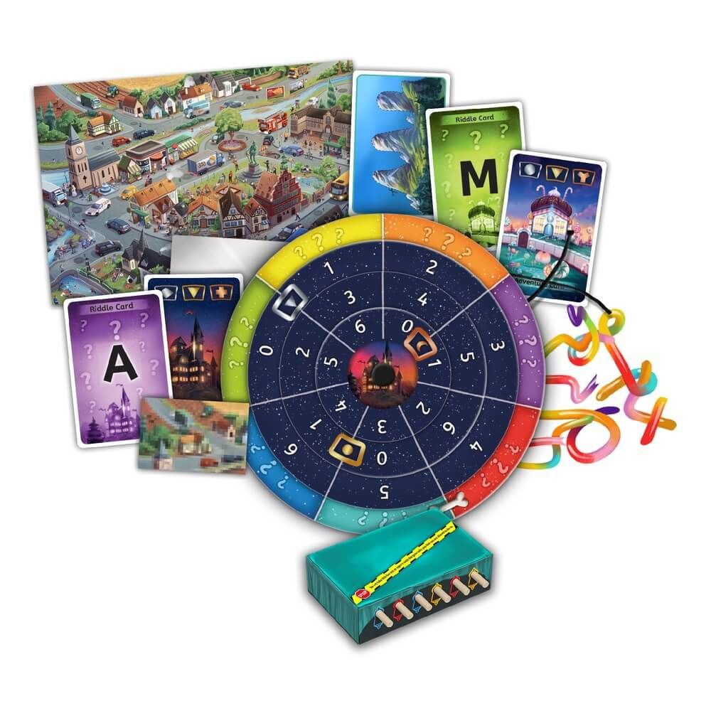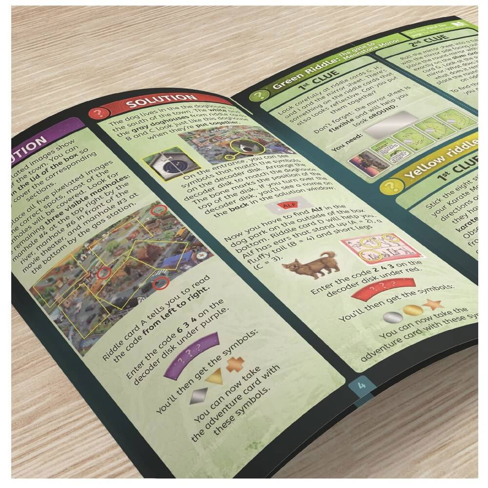 - The Mystery at Meanstone Manor contine 36 de carti (aventura, enigme si ajutor), 1 disc de decodare, 8 obiecte misterioase (imagini pixelate, autocolante, oglinda, cusca), si o imagine de oras tip harta.