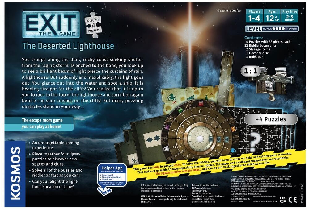 In Exit Puzzle: The Deserted Lighthouse (EN), jucatorii lucreaza impreuna pentru a finaliza fiecare dintre cele patru puzzle-uri si a rezolva enigmele integrate in ilustratii. Fiecare puzzle reprezinta o parte a farului si contine indicii vizuale care duc la urmatorul pas. Folosind discurile decodor, trebuie sa introduci codurile corecte pentru a descoperi noi documente, obiecte si indicii care te ajuta sa urci spre varf. Pe parcurs, poti scrie, taia sau plia materialele – totul este permis pentru a gasi solutia corecta. Scopul este sa rezolvi toate ghicitorile in ordine si sa reactivezi lumina farului inainte ca nava sa se zdrobeasca de stanci.