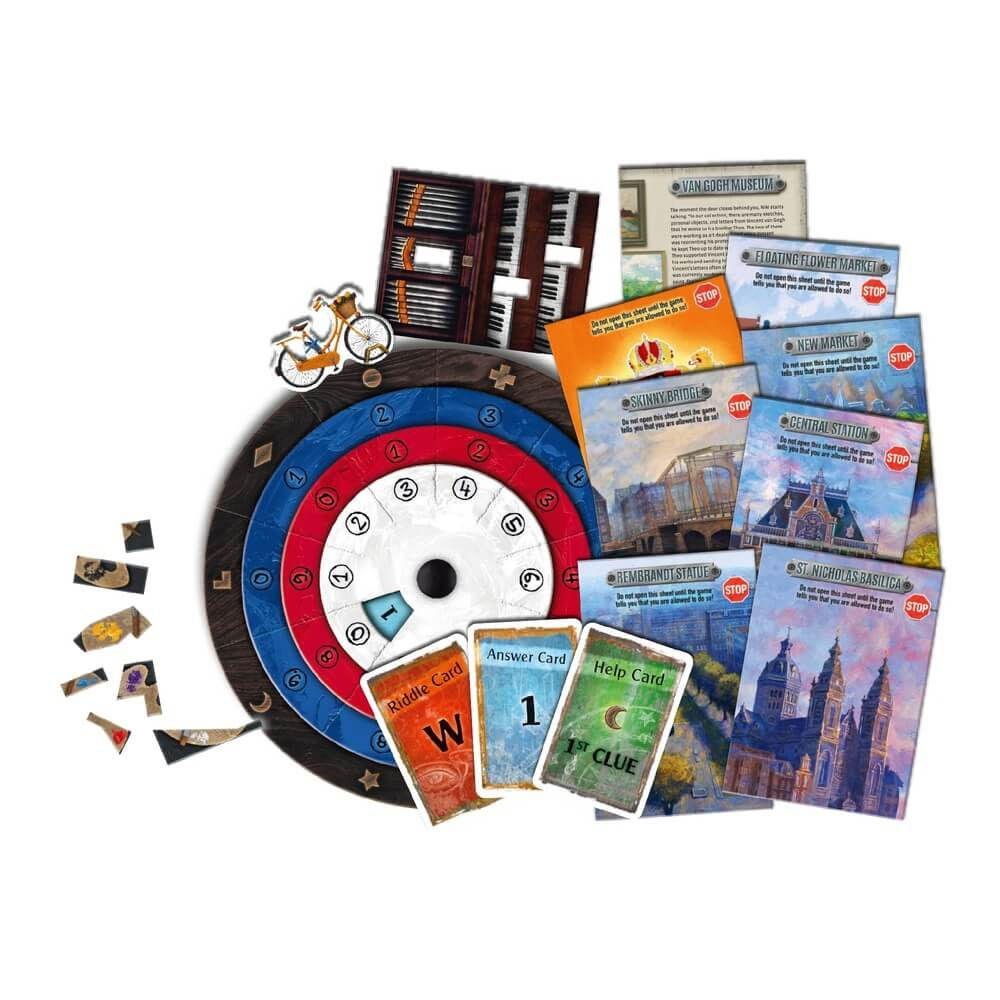 Cutia include 88 de carti (28 carti de enigme, 30 carti de ajutor si 30 carti de raspuns), 9 obiecte misterioase, 8 foi pliate, 1 disc de decodare si 1 plansa a muzeului Van Gogh. In plus, sunt necesare accesorii uzuale precum creion, hartie, foarfeca si cronometru. Jocul este compatibil cu aplicatia Kosmos Helper App, care ofera timer digital si un fundal sonor tematic, completand atmosfera autentica a unei anchete artistice in inima Amsterdamului.