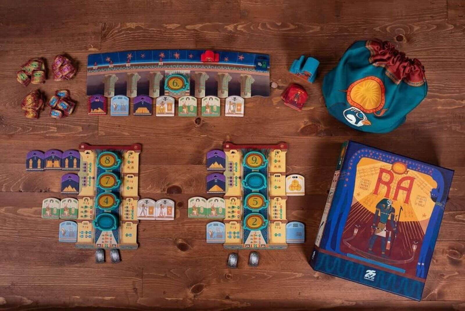 Continutul jocului RA – Retail Edition (EN) include 180 placi de licitatie, 1 tabla de licitatie, 5 planse de jucator, 1 statueta Ra, 1 marker Sun Boat, 16 discuri Sun din lemn, 1 contor de epoca din lemn, 80 jetoane de scor, 1 sac textil si regulamentul de joc in limba engleza.