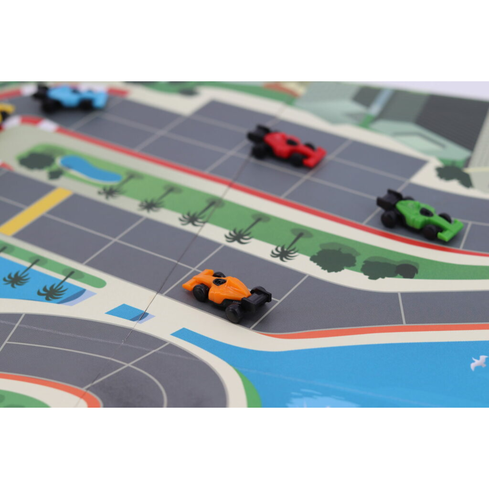 1 tabla de joc cu un circuit detaliat, 6 masini de curse colorate, 42 de carti de viteza pentru controlul masinilor, 6 carti cu abilitati speciale unice, Jetoane pentru pariuri si bani, Regulament clar si usor de inteles.