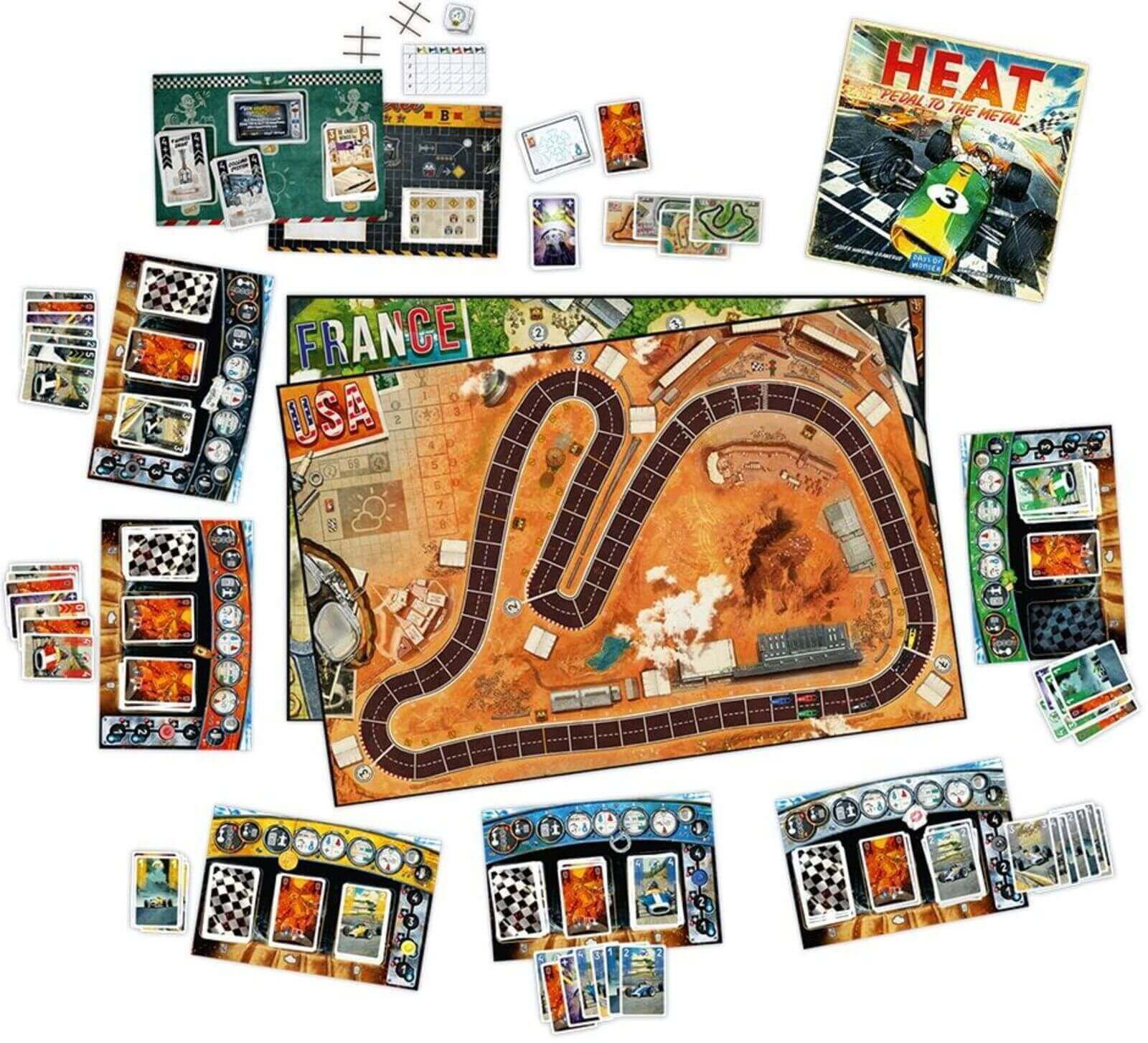 In Heat: Pedal to the Metal (EN), jucatorii folosesc carti pentru a controla acceleratia, franarea si gestionarea temperaturii motorului. Trebuie sa abordezi curbele cu precizie, sa alegi momentul potrivit pentru a forta viteza si sa eviti supraincalzirea. Poti juca curse individuale sau un campionat complet, unde conditiile de cursa se schimba constant.