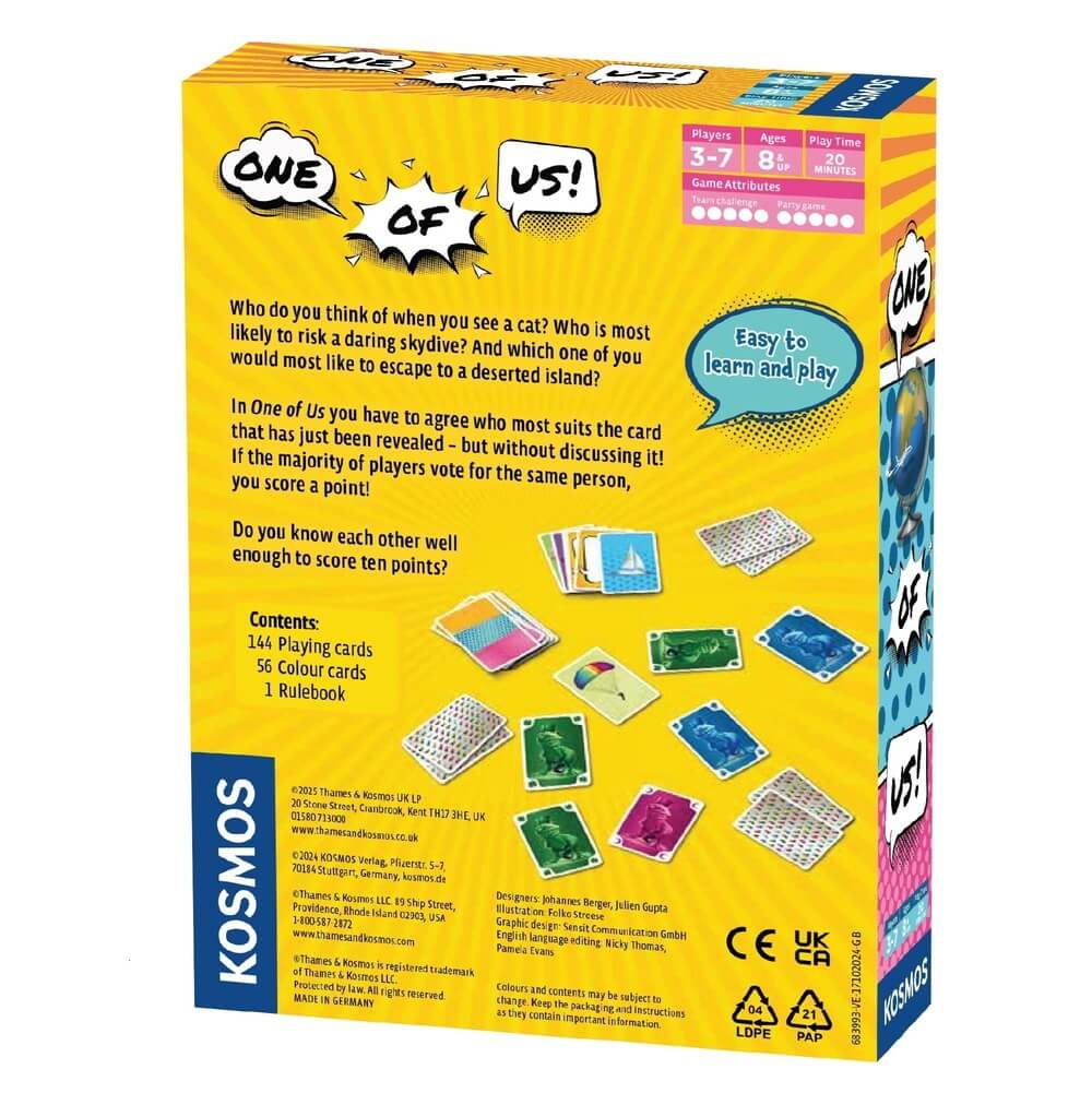 In One of Us (EN), jucatorii trebuie sa se cunoasca mai bine si sa descopere cat de bine isi inteleg prietenii. Fiecare carte prezinta o imagine, o expresie sau un titlu de melodie, iar scopul este sa decideti in tacere care persoana din grup se potriveste cel mai bine cu acea carte. Daca majoritatea jucatorilor aleg aceeasi persoana, echipa castiga un punct.