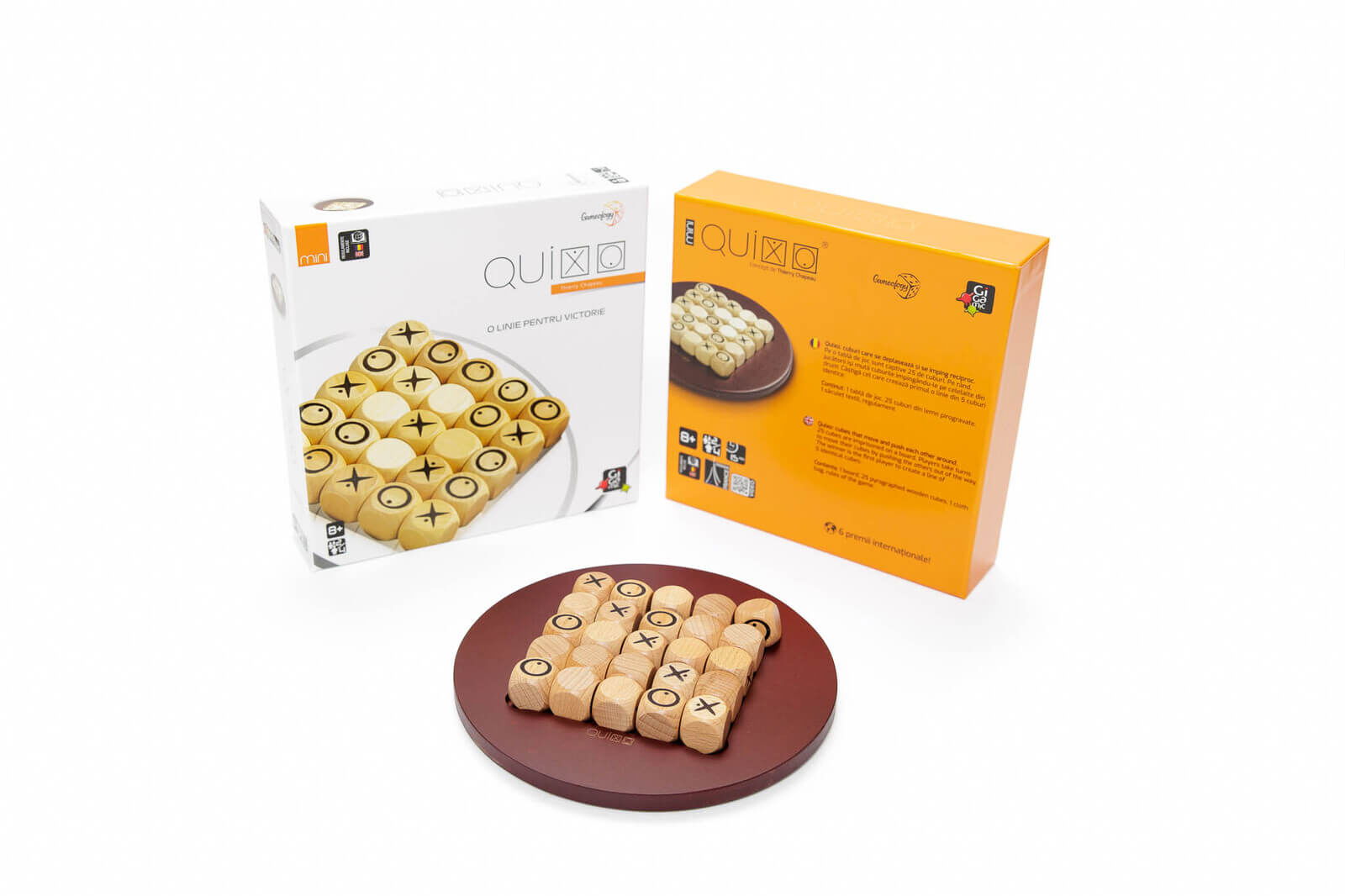 Quixo Mini (RO-EN) este versiunea portabila a celebrului joc abstract Quixo. Cu reguli simple dar decizii strategice interesante, jocul combina intuitia si gandirea tactica intr-un duel captivant pentru 2 sau 4 jucatori. Obiectivul este sa creezi o linie de 5 simboluri identice, dar pentru asta va trebui sa impingi, rotesti si sa te adaptezi constant miscarilor adversarului.