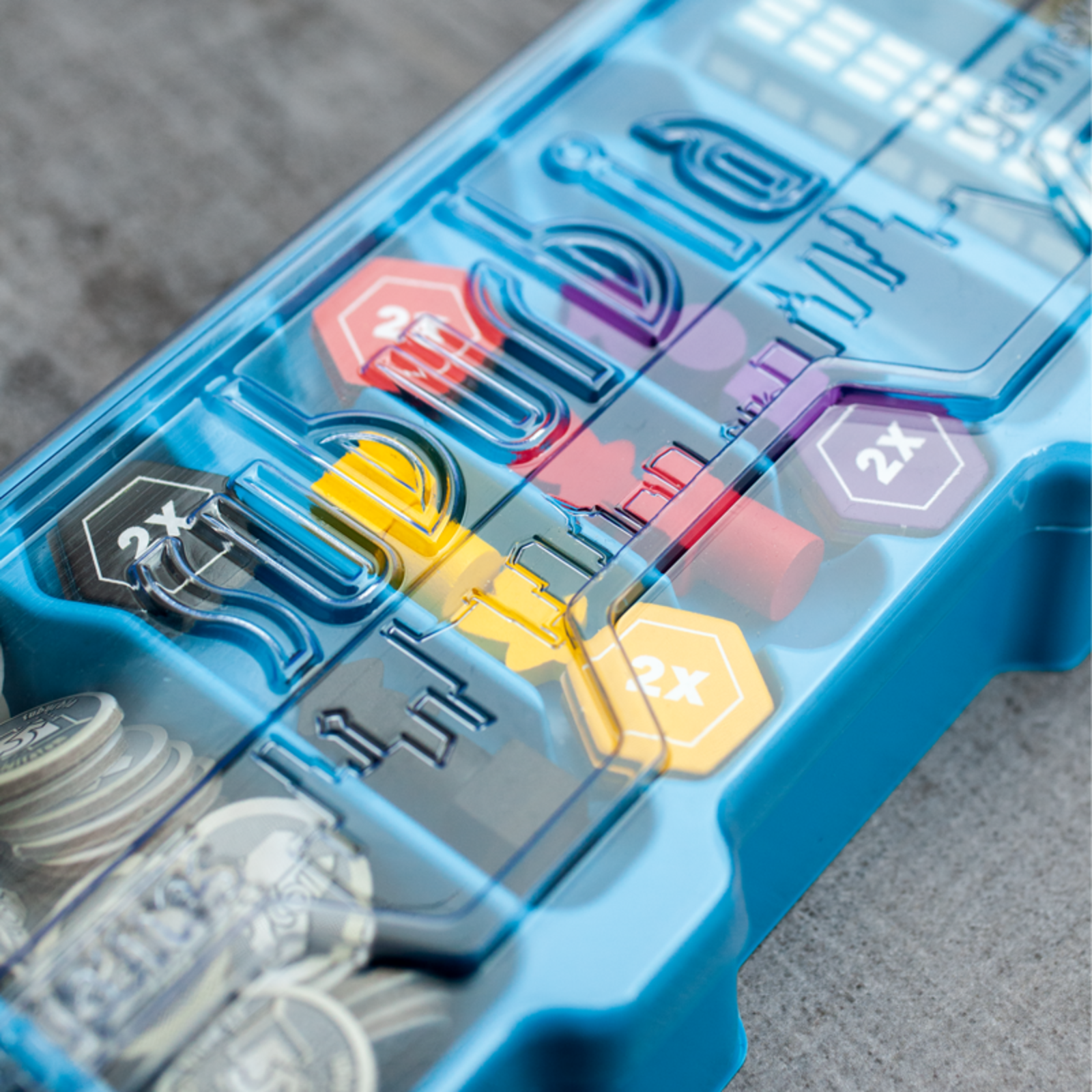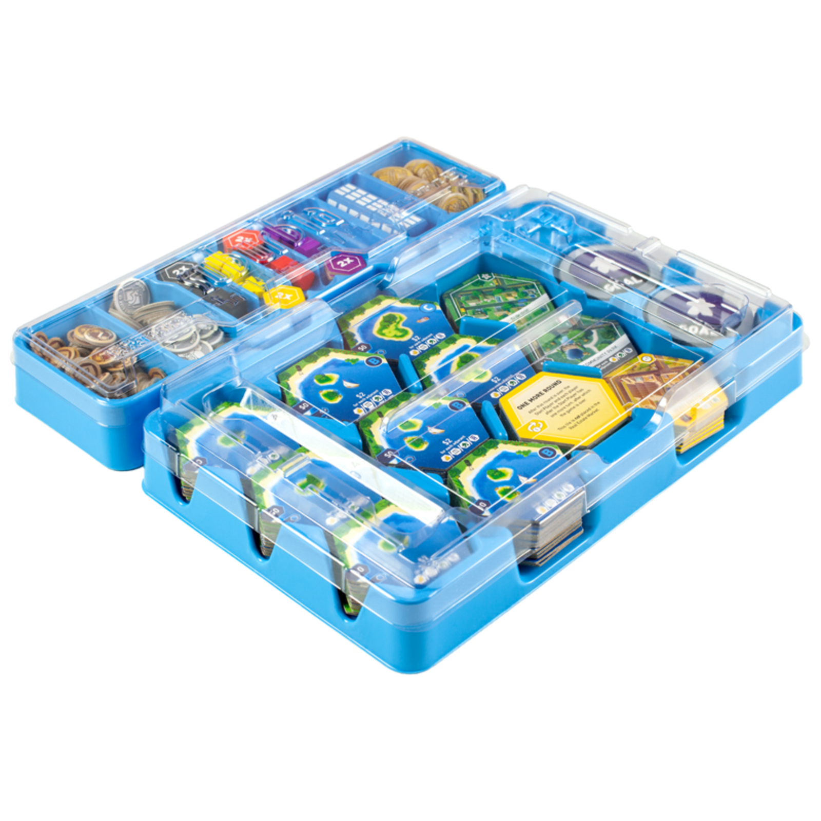 1 tabla de joc a populatiei, 1 tabla pentru teancuri, 1 tabla de aprovizionare, 1 tabla a pietei imobiliare, 4 placi cu orasele, 8 suburbii, 8 fabrici, 8 parcuri, 1 cartonas „INCA O RUNDA”, 32 de piese A. 36 de piese B, 32 de piese C, 20 de piese „Scop”, 4 cartonase ajutatoare, 1 indicator al primului jucator, 126 de jetoane „Bani”, 4 cuburi de reputatie, 4 patrate de populatiei, 12 marcatori ai investitiilor, 4 cilindri ai veniturilor, instructiuni.
