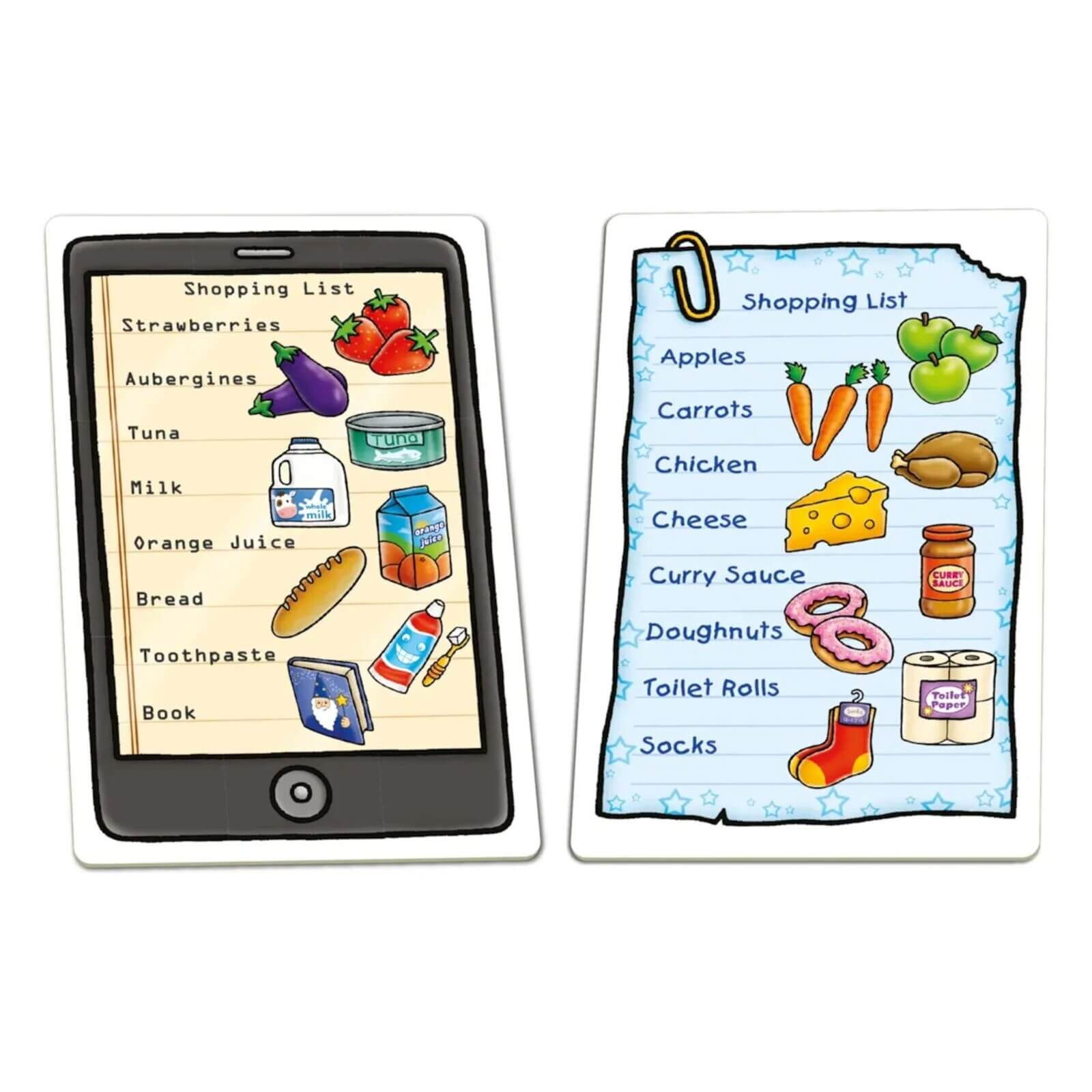 Shopping List (EN) este un joc competitiv clasic de asociere si memorie, in care copiii pornesc intr-o sesiune distractiva de cumparaturi. Scopul jocului este simplu: fiecare jucator trebuie sa gaseasca produsele corecte de pe lista sa si sa isi umple primul caruciorul sau cosul de cumparaturi.