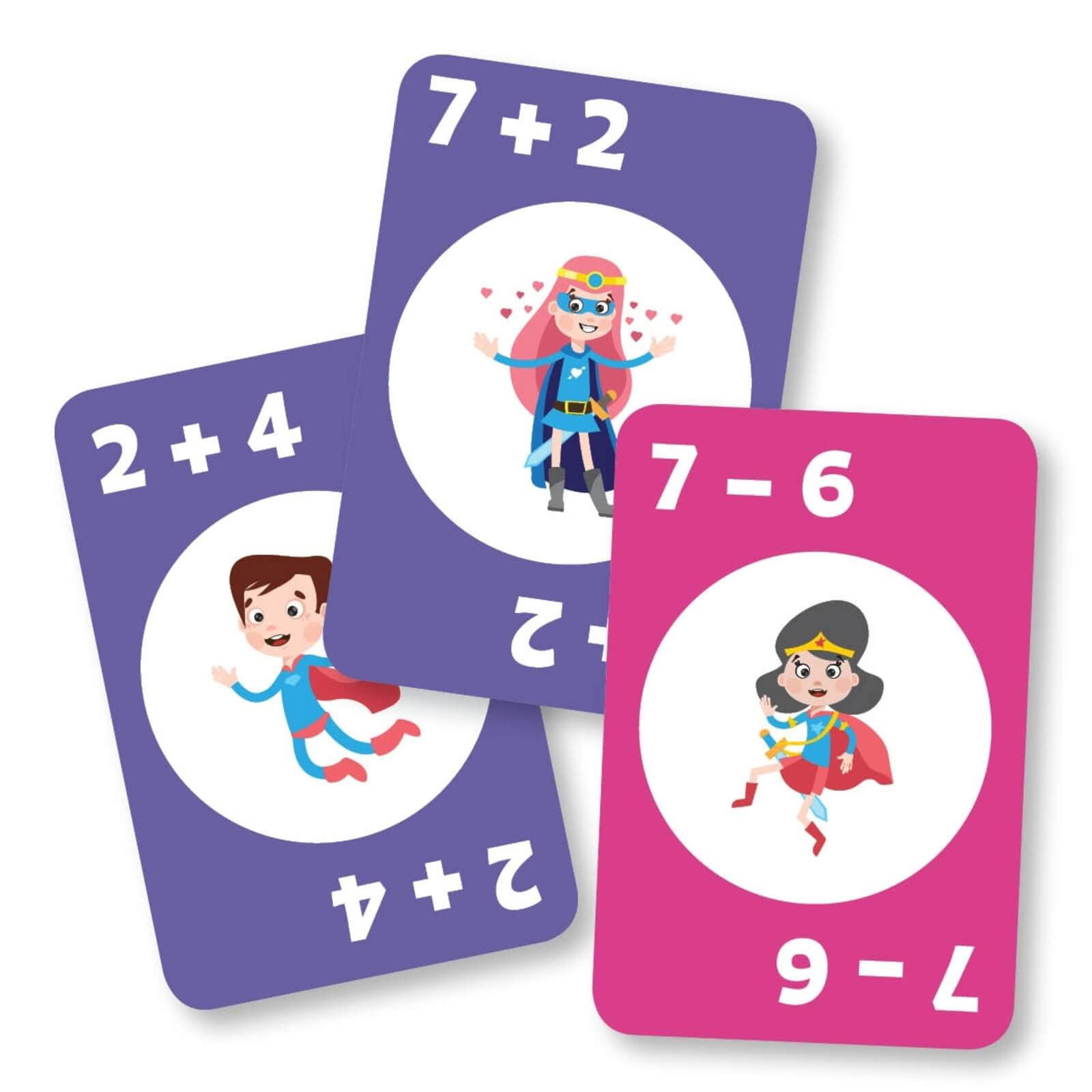 In Adunari si scaderi - Razboi matematic (RO), jucatorii trag carduri si rezolva rapid operatiile matematice indicate. Duelurile de calcul decid cine castiga runda si cine aduna supereroii in colectia sa. Pe masura ce jocul avanseaza, competitia devine tot mai intensa, iar jucatorul care reuseste sa adune toti supereroii devine castigator.