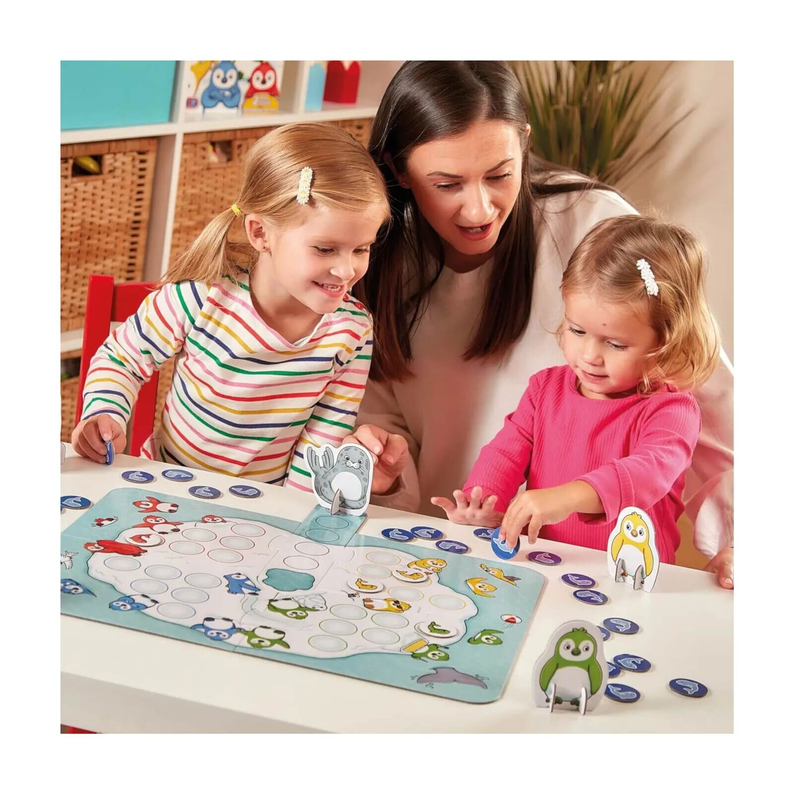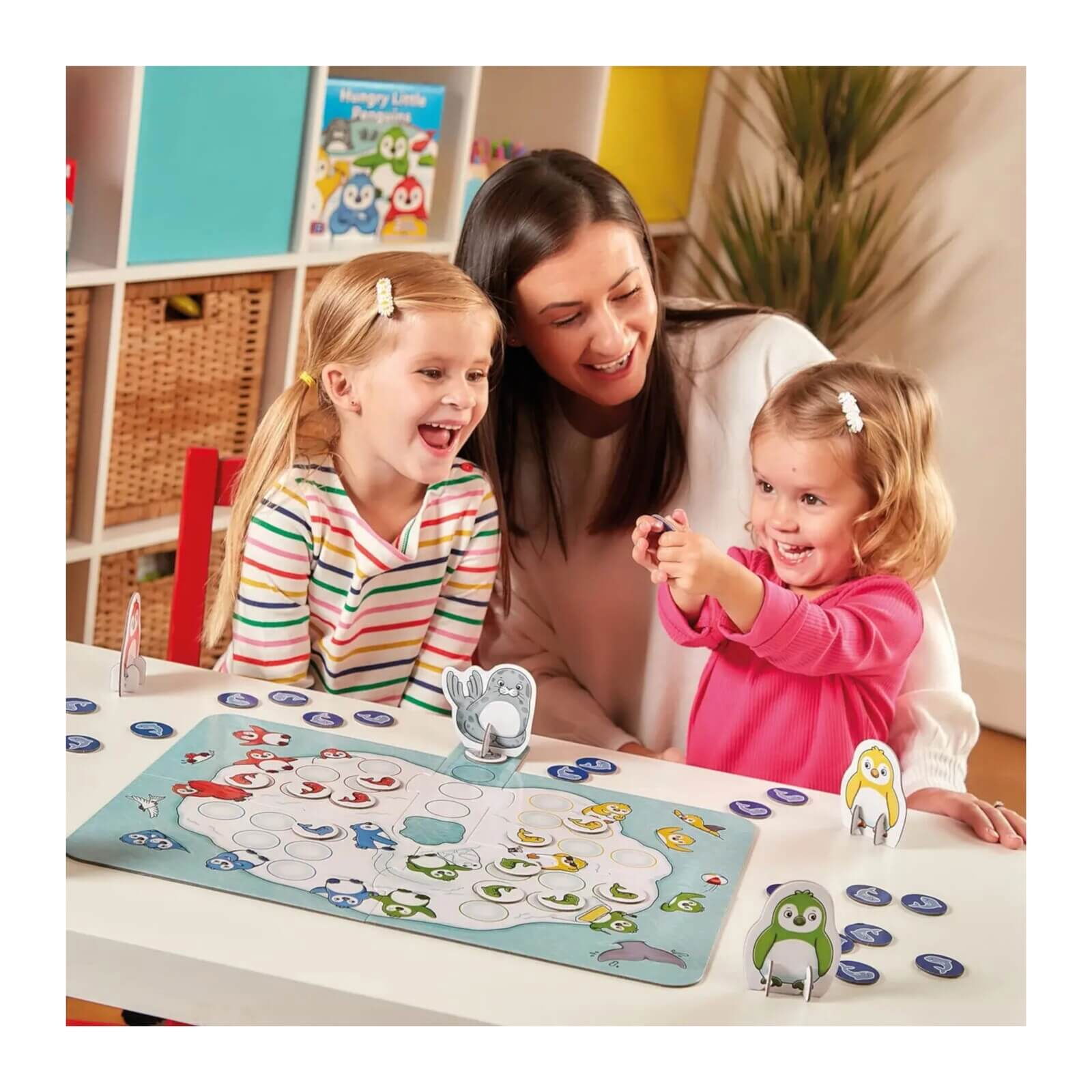 In varianta colaborativa a jocului Hungry Little Penguins (RO-EN), jucatorii lucreaza impreuna pentru a completa aisbergul cu pestisori colorati, potrivind cartile corecte, inainte ca foca sa ajunga in centru.