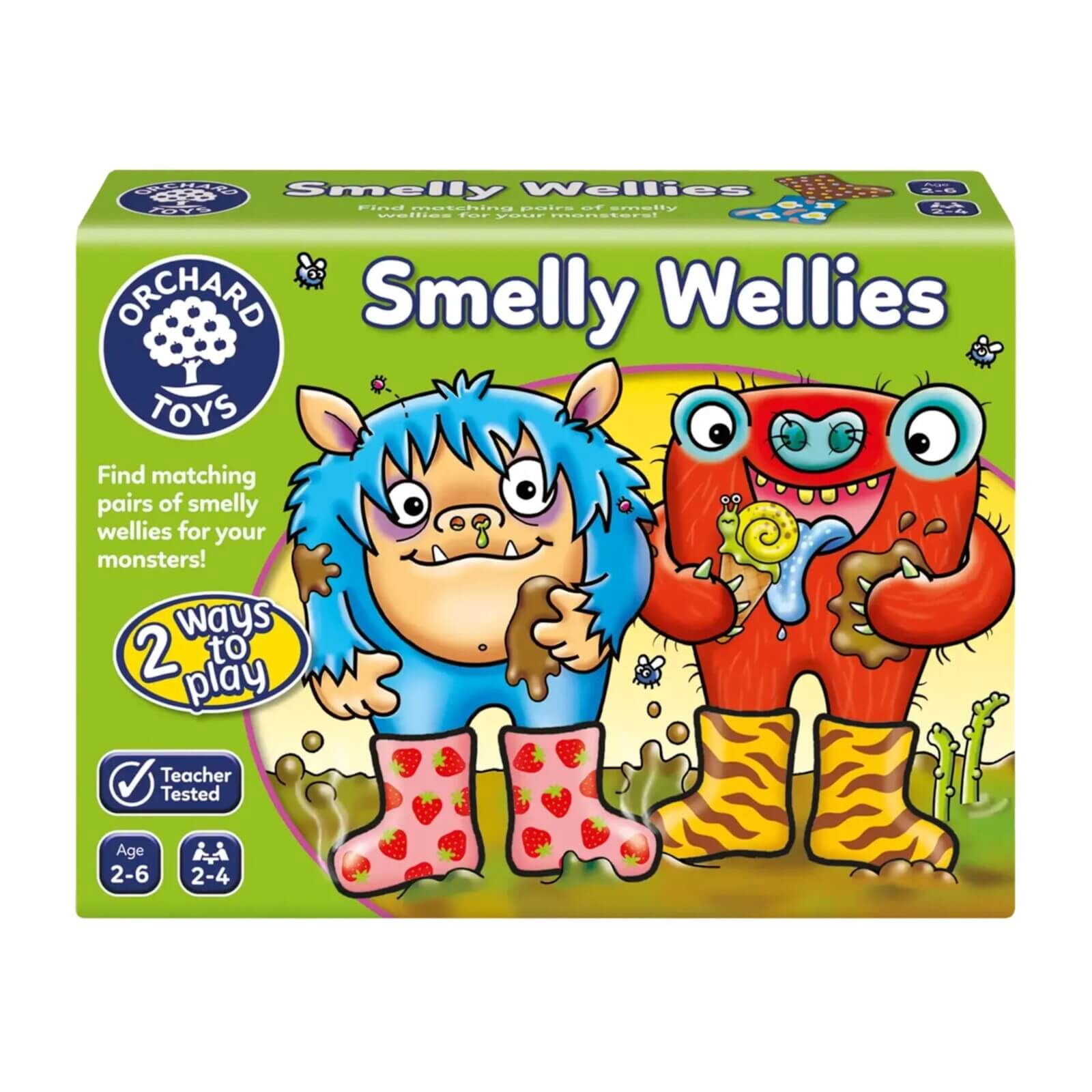 In Smelly Wellies (RO-EN), fiecare jucator primeste o plansa cu un monstru si trebuie sa gaseasca perechile corecte de cizmulite pentru a-si completa tabla. Cartile se intorc pe rand, iar copiii incearca sa potriveasca modelele identice. Jocul poate fi jucat in doua variante: una simpla, de potrivire directa pentru cei mai mici, si una tip memorie, pentru copiii mai mari care vor o provocare in plus. Castiga primul jucator care isi completeaza plansa.
