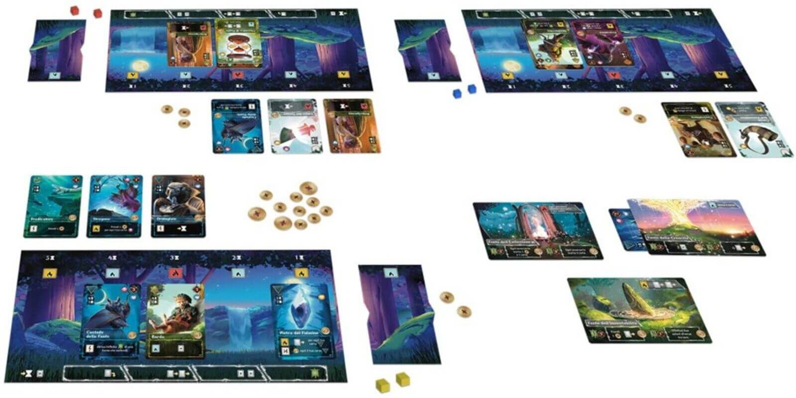 Jocul include peste 100 de carti unice, placi de timp glisante, jetoane de resurse, componente din lemn si carton pentru fiecare factiune, tabla de joc si regulamentul complet in limba engleza.