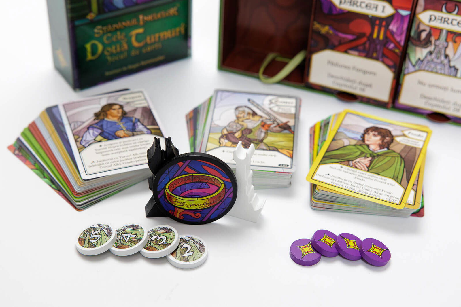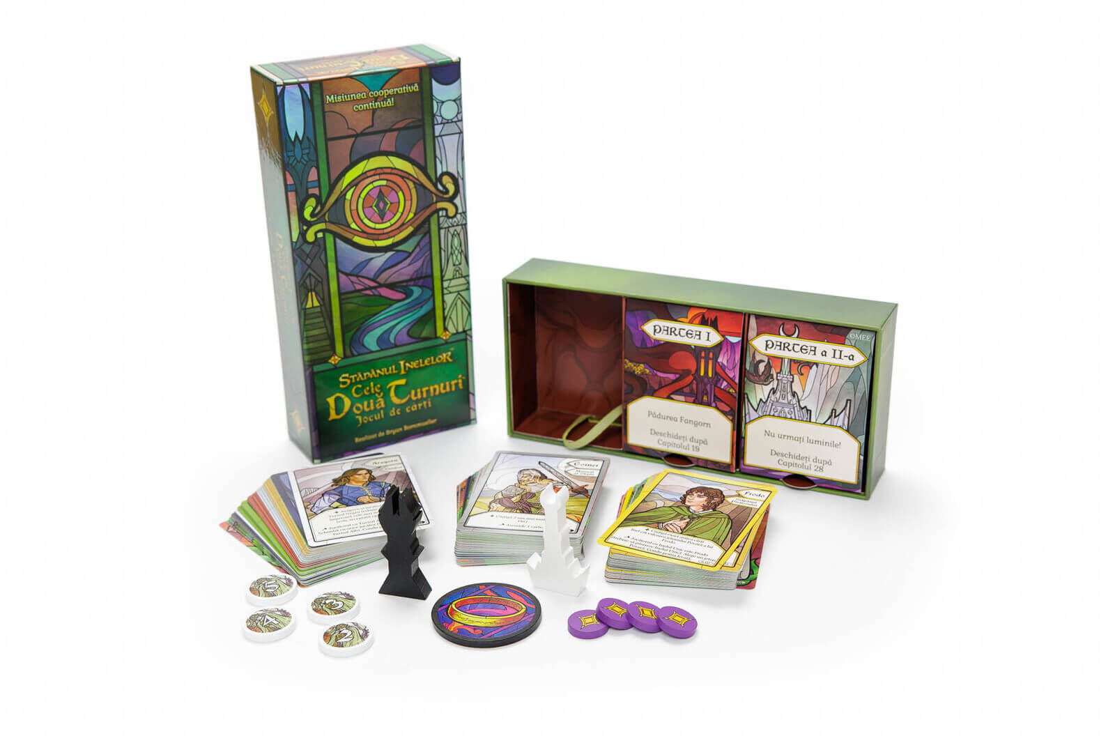 Stapanul Inelelor - Cele Doua Turnuri (RO) contine un pachet principal de carti pentru levate, carti de capitol care structureaza povestea si scenariile, carti de personaj cu obiective si abilitati speciale, carti speciale precum Turnurile, Orcii, Inelele si Epuizarea, jetoane din lemn pentru urmarirea obiectivelor si progresului, precum si carti de referinta pentru jucatori.