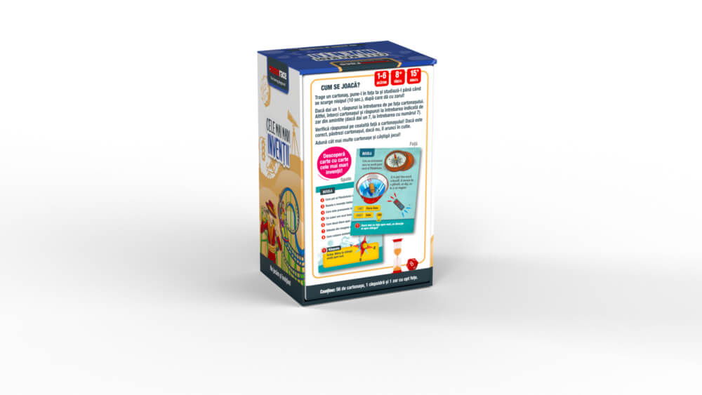 Memorace - Cele mai mari inventii (RO) este un joc distractiv, dar in acelasi timp educativ. Noile informatii iti vor trezi interesul fata de inventiile care au revolutionat lumea. Care este nordul, care este sudul, cine a inventat avionul sau cate fete are o piramida, sunt doar cateva dintre intrebarile care se vor regasi pe cartonase. Memoria va fi cea testata in Memorace - Cele mai mari inventii (RO) , acest joc al curiozitatilor.