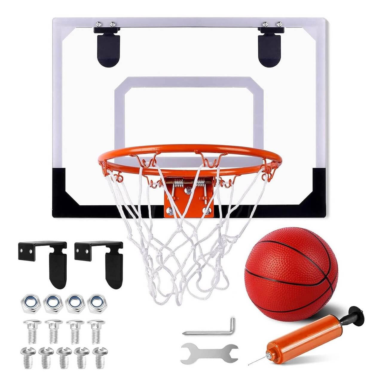 1 panou, 1 plasa, 1 inel de baschet, 1 balama, 6 benzi de protectie, 1 carlig, 1 minge, 4 suruburi, 4 piulite, 1 pompa cu aer manuala, 1 surubelnita, instructiuni.