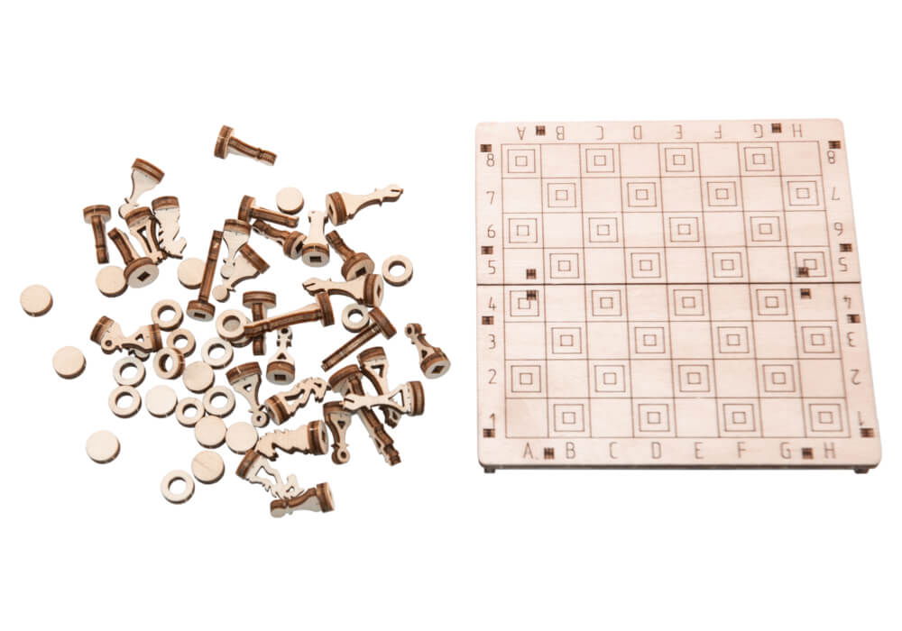 Puzzle 3D - Mini joc Sah si Dame face parte din seria de Jocuri de societate in miniatura. Acesta este confectionat din lemn ecologic si de aceea este considerat sustenabil si prietenos cu mediul, iar pentru asamblarea acestuia nu vei avea nevoie de lipici.