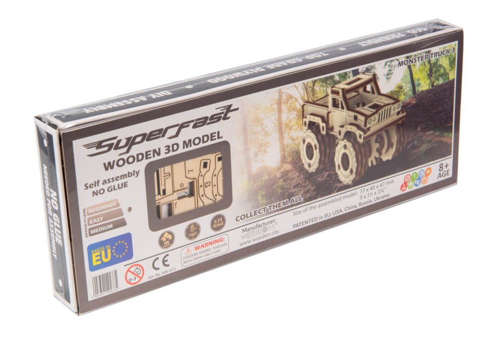 Puzzle mecanic 3D - Monster Truck 3 este confectionat din lemn ecologic, fiind sustenabil si prietenos cu mediul.