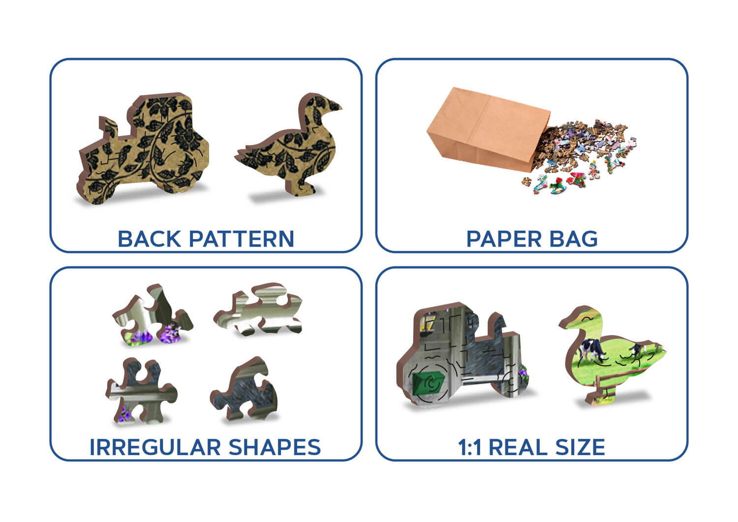 Un detaliu important si care diferentiaza acest Puzzle din lemn - Countryside Garden - 200 piese de cele clasice este forma neobisnuita pe care o au piesele acestuia. Nu seamana cu cele standard, fiind decupate cu ajutorul unui laser, dintr-un placaj de mesteacan. Pe deasupra, cernelurile colorate folosite pentru a picta piesele sunt sigure pentru copii.