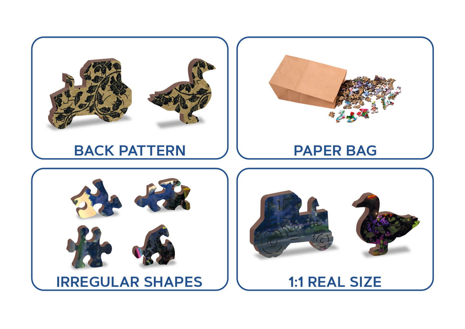 Acest Puzzle din lemn - Evening at the Lakehouse - 200 piese are un element definitoriu cu totul unic fata de puzzle-urile clasice. Piesele sale nu au forme standard, in schimb, acestea sunt care mai de care mai unice si aparte. Acestea au fost decupate dintr-un placaj de mesteacan cu ajutorul unui laser, iar cernelurile folosite la pictarea acestora sunt sigure pentru cei ce le folosesc.
