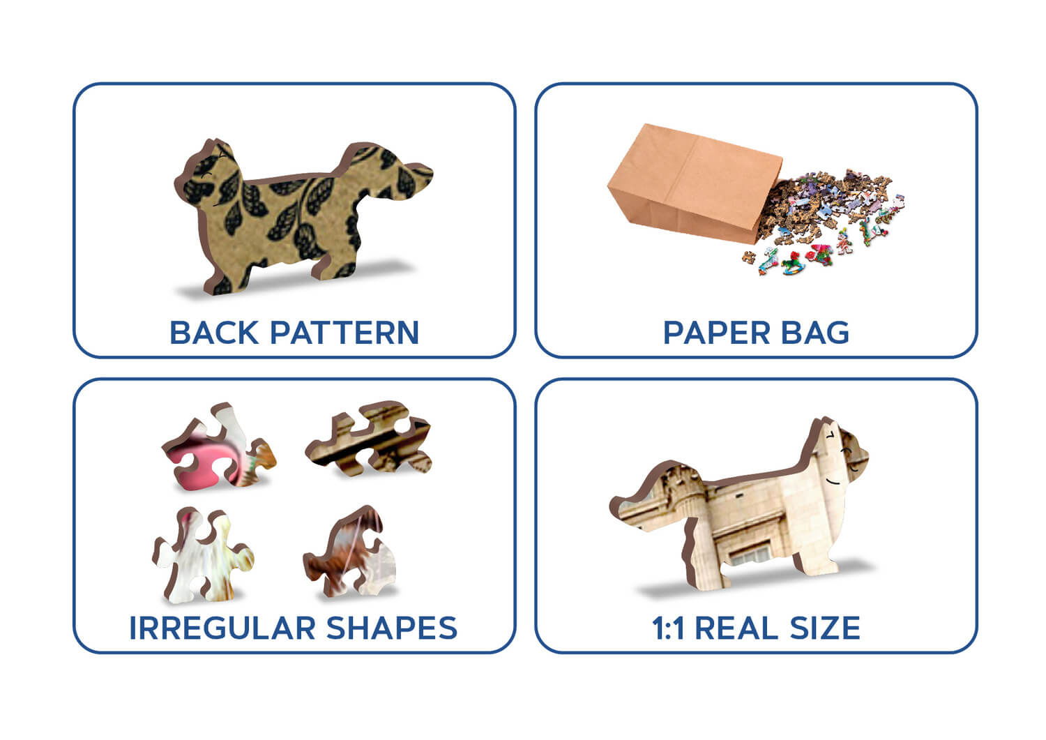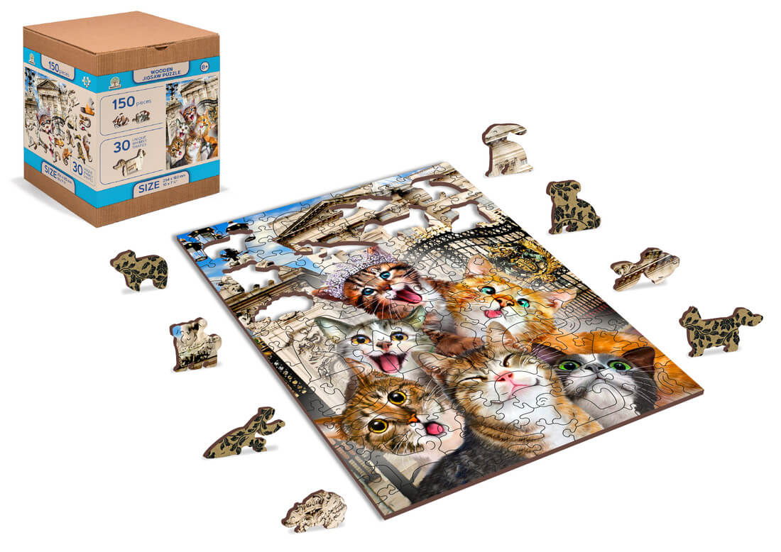 Puzzle din lemn - Kittens in London - 150 piese se face remarcat datorita elementului sau diferentiator. Piesele acestui set sunt neobisnuite ca forma, fiind categoric unice. Acestea sunt taiate cu ajutorul unui laser, dintr-un placaj de mesteacan. Cernelurile folosite pentru vopsirea pieselor sunt sigure pentru copii, nu reprezinta niciun pericol.