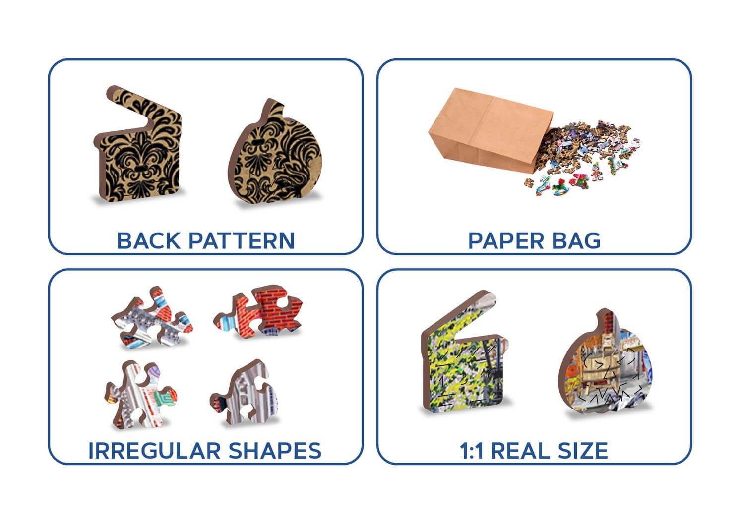 Priviti mai atent, deoarece piesele acestui Puzzle din lemn - Main Street - 200 piese au forme care mai de care mai neobisnuite. Nu se aseamana cu cele standard, reprezentand un element care face diferenta. Decupate dintr-un placaj de mesteacan cu ajutorul unui laser, piesele sunt imprimate cu cerneluri in culori vibrante, non-toxice.