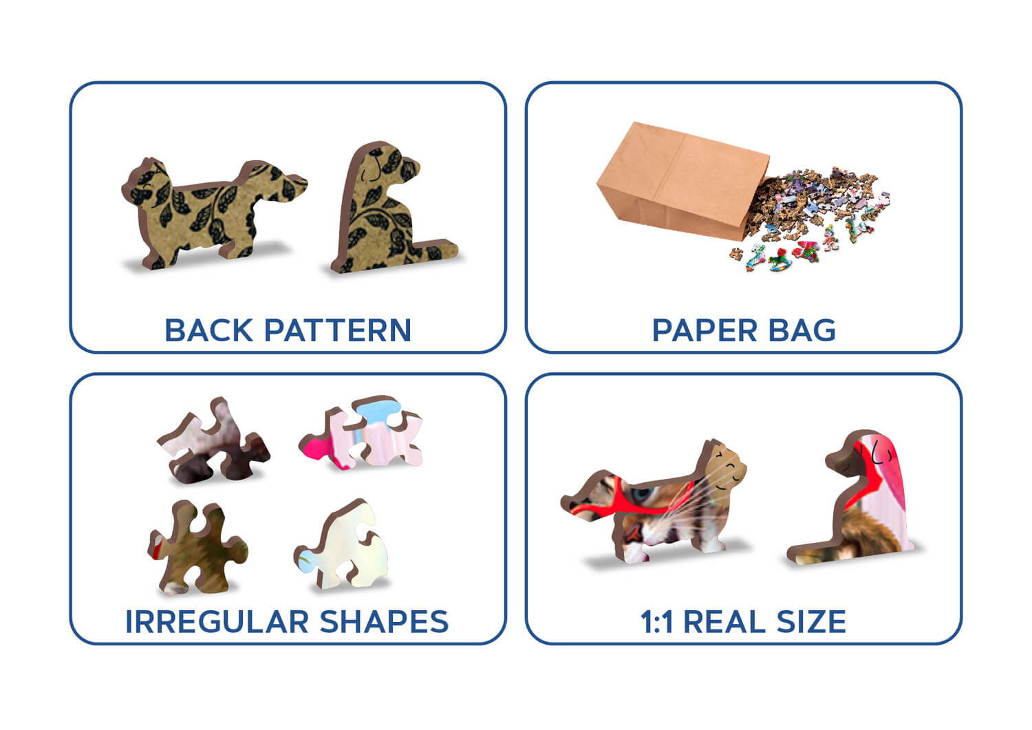 Detaliul important care chiar face diferenta este faptul ca piesele acestui puzzle sunt atipice ca forma. Acestea nu seamana deloc cu cele clasice, fiind taiate cu ajutorul unui laser dintr-un placaj de mesteacan. Cerneala colorata folosita este non-toxica si sigura pentru cei mici.