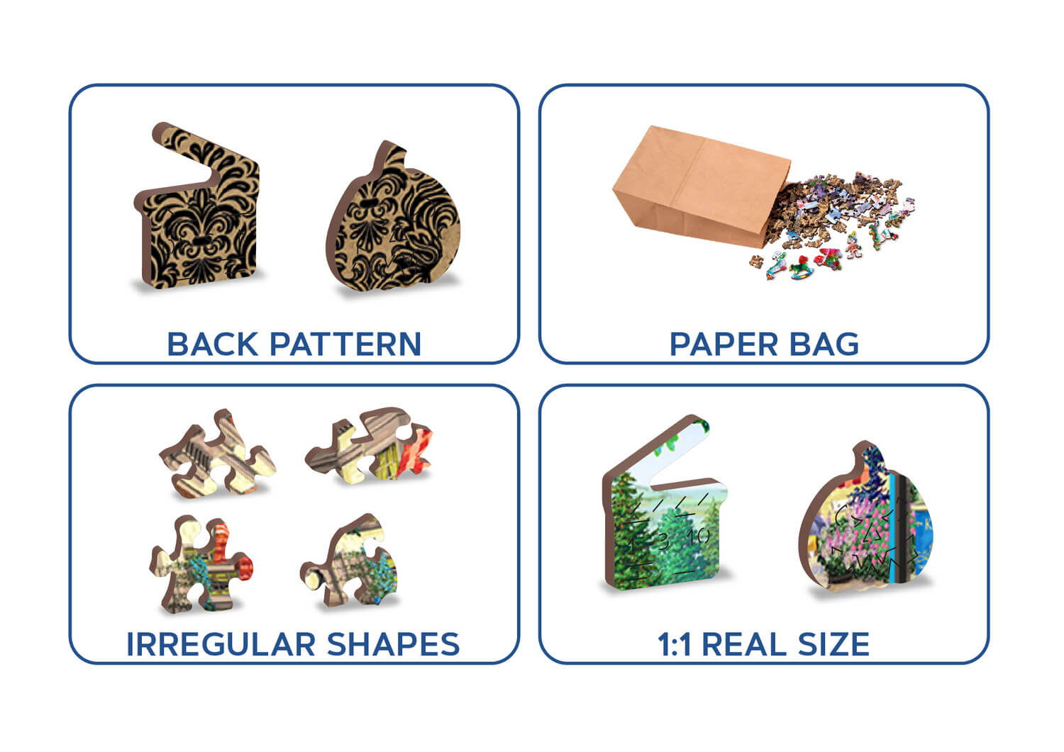 Ceea ce face acest Puzzle din lemn - Victorian Street - 200 piese cu adevarat special este cu siguranta unicitatea fiecarei piese. Acestea sunt diferite de formele standard, fiind decupate cu ajutorul laserului, dintr-un placaj de mesteacan. Culorile folosite pentru imprimarea acestora sunt cerneluri viu colorate si non-toxice.