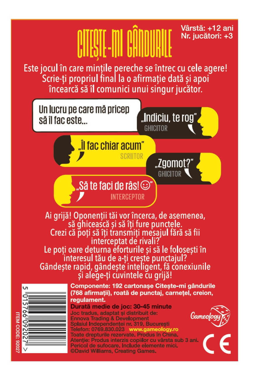 192 cartonase Citeste-mi gandurile (768 afirmatii), roata de punctaj, carnetel, creion, regulament in limba romana.