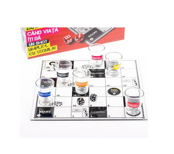 1 tabla de joc cu porunci, 2 zaruri, 6 pahare de shoturi si instructiuni de joc in limba romana.