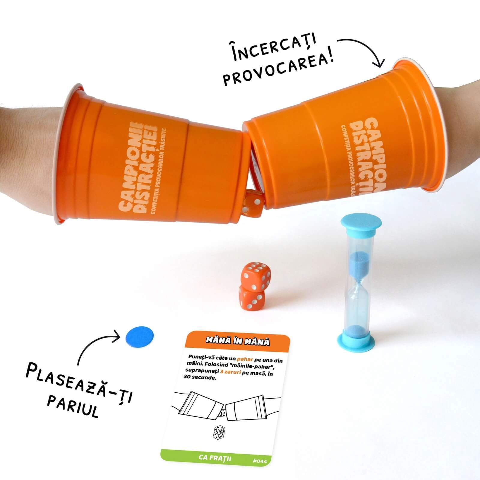 160 cartonase cu Provocari, 80 jetoane, 10 pahare, 5 mingi, 4 zaruri, betisoare din plastic, carnetel, metru, clepsidra si instructiuni de joc in limba romana.